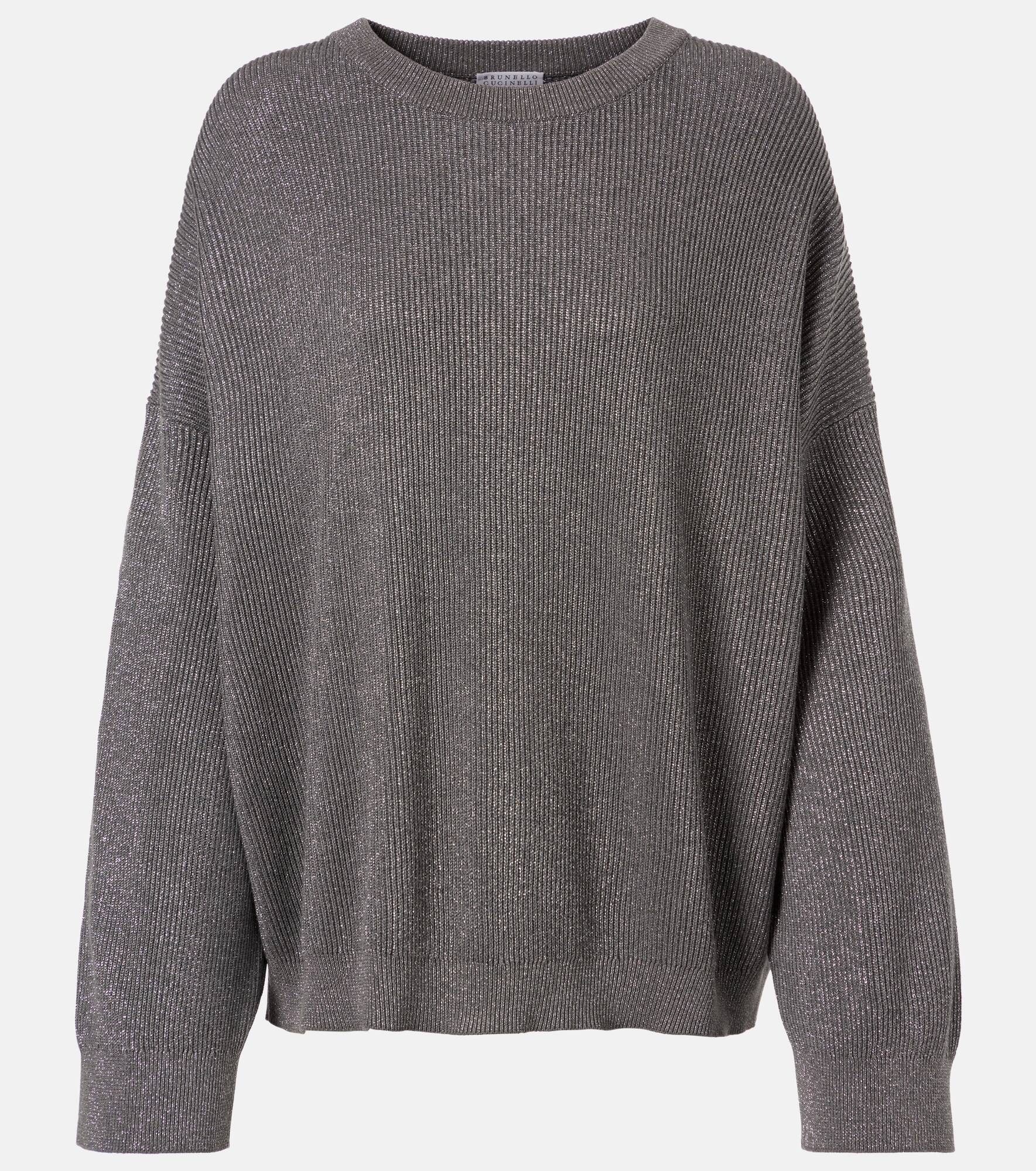 This sweater from Brunello Cucinelli is rib-knitted from a cotton blend and woven with metallic fibers to create a delicately glimmering appearance. Pair it with the brand's matching pants for a chic knitted look. Product Details - Material: 72% cotton, 22% viscose, 6% metallic fibres - Care instructions: hand wash - Made in Italy - Designer color name: Grigo Scuro - Collar: crewneck - Cuff: ribbed - Hem: ribbed - Item number: P01041523 Size & Fit - True to size - Dropped shoulders - Designed for a loose fit - Slightly stretchy fabric - Falls below the hip - The model seen in the picture is 178cm-5'10" and wearing a size XS