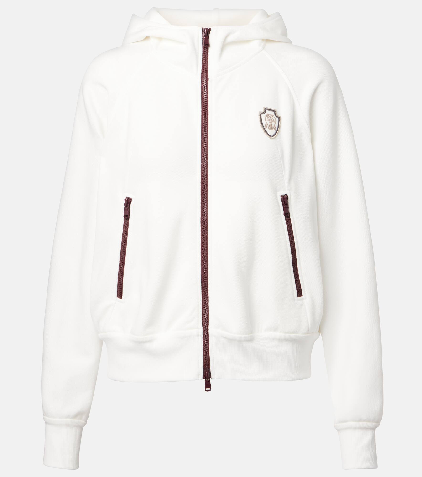 Channel refined athleticism with this hoodie from Brunello Cucinelli. The zip-up style is crafted from cotton-blend pique and features the iconic Solomeo crest at the chest. Product Details - Material: 93% cotton, 7% polyamide - Care instructions: dry clean - Made in Italy - Designer color name: Off White+Amaranto - Item color: white, burgundy - Material II: 90% cotton, 10% elastane - Sleeves: raglan - Closure: zipped front - Hood - Item number: P01083482 Size & Fit - True to size - Designed for a loose fit - Elasticated hem - Slightly stretchy fabric - Height of model is 174cm-68.5" and wears a size XS