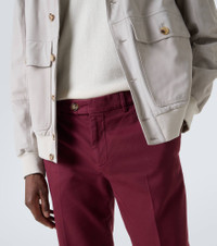 Brunello Cucinelli's designs are created in Solomeo, a medieval hamlet whose art and traditions are woven into the house's every fiber. Crafted from cotton gabardine, these pants are cut to a fitted silhouette. Product Details - Material: 100% cotton - Care instructions: machine wash at 30 degrees - Made in Italy - Designer color name: C6030 - Item color: red - Lining: 100% cotton - Lining II: 58% cotton, 42% polyester - Contains non-textile parts of animal origin - Item number: P01056055 Size & Fit - True to size - Non-stretchy fabric - Slim-leg - Height of model is 189cm-74.5" and wears a size 50