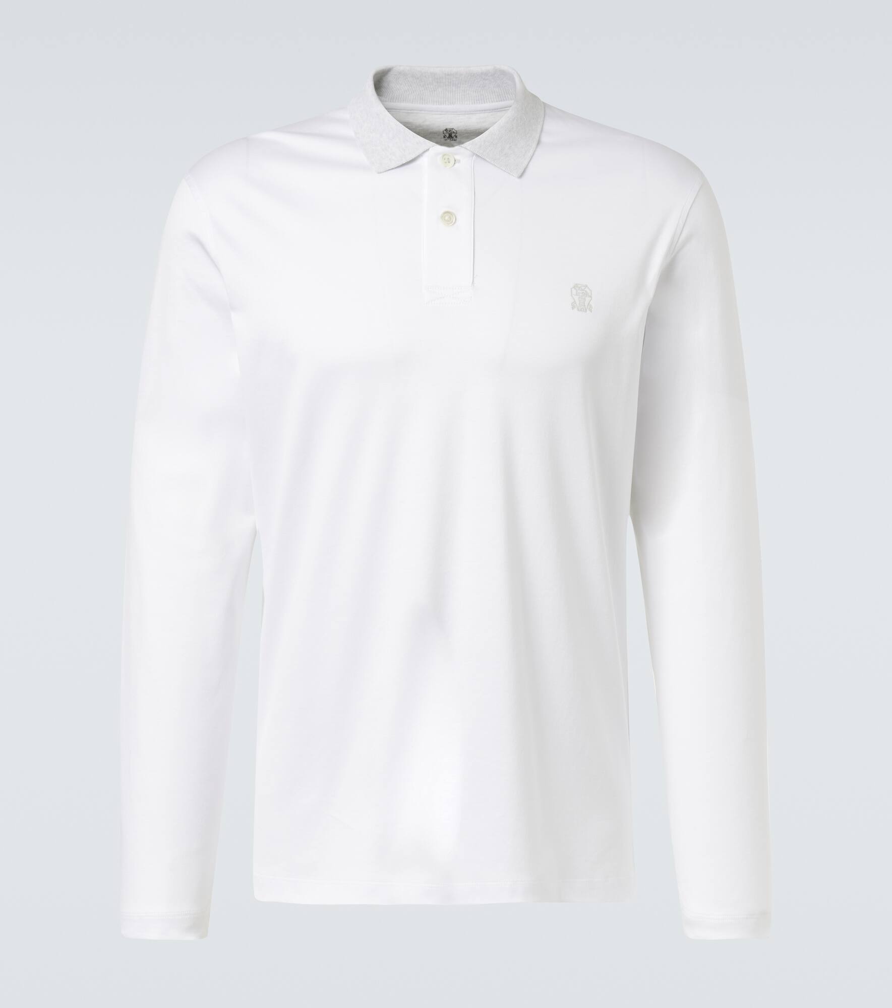 This Brunello Cucinelli polo shirt is embroidered with the iconic Solomeo crest at the chest. Crafted from pure cotton, this long-sleeved style features a contrasting shirt collar and half-buttoned front. Product Details - Material: 100% cotton - Care instructions: machine wash at 30 degrees - Made in Italy - Designer color name: Cw787 - Item color: white - Contains non-textile parts of animal origin - Polo shirt - Item number: P01056083 Size & Fit - True to size - Designed for a loose fit - Slightly stretchy fabric - Falls to the hip - Height of model is 189cm-74.5" and wears a size L