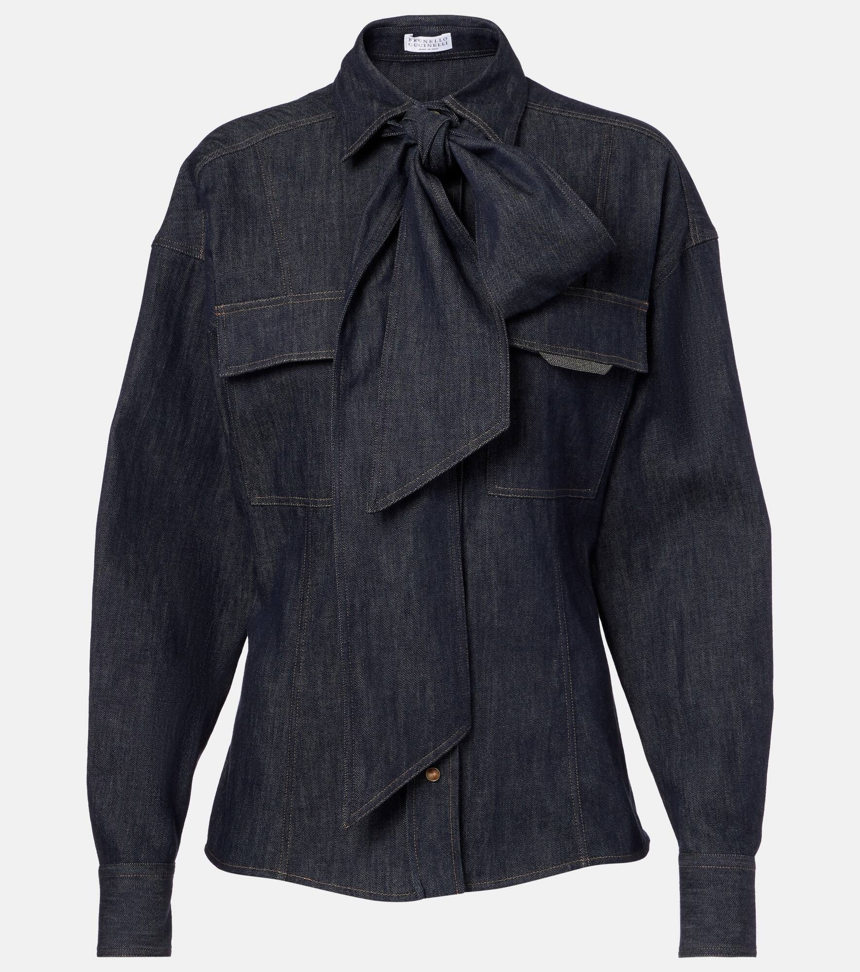 Lightweight no-fade denim pussybow shirt with shiny flap detail