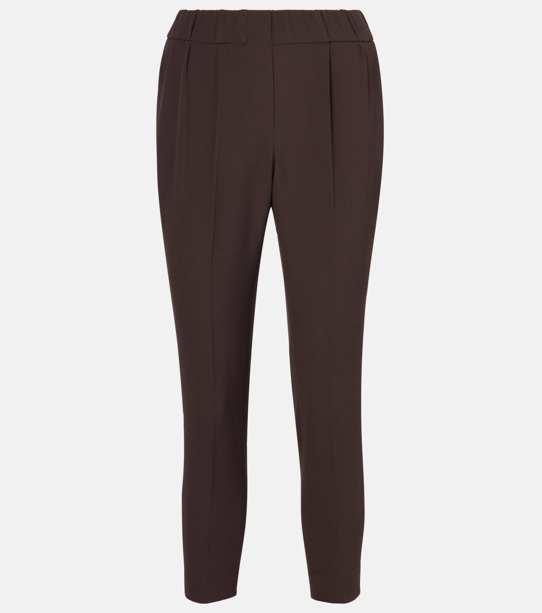 Brunello Cucinelli's designs are created in Solomeo, a medieval hamlet whose art and traditions are woven into the house's every fiber. Made from crepe, these slim pants are complete with pleats and an elasticated waistband for added comfort. Product Details - Material: 52% acetate, 48% silk - Care instructions: dry clean - Made in Italy - Designer color name: Dark Chocolate - Item color: brown - Item number: P01054272 Size & Fit - True to size - Elasticated waist - Slightly stretchy fabric - Slim-leg - Sits low on the hips - The model seen in the picture is 178cm-5'10" and wearing a size IT 40
