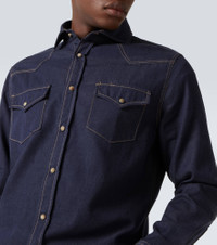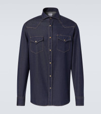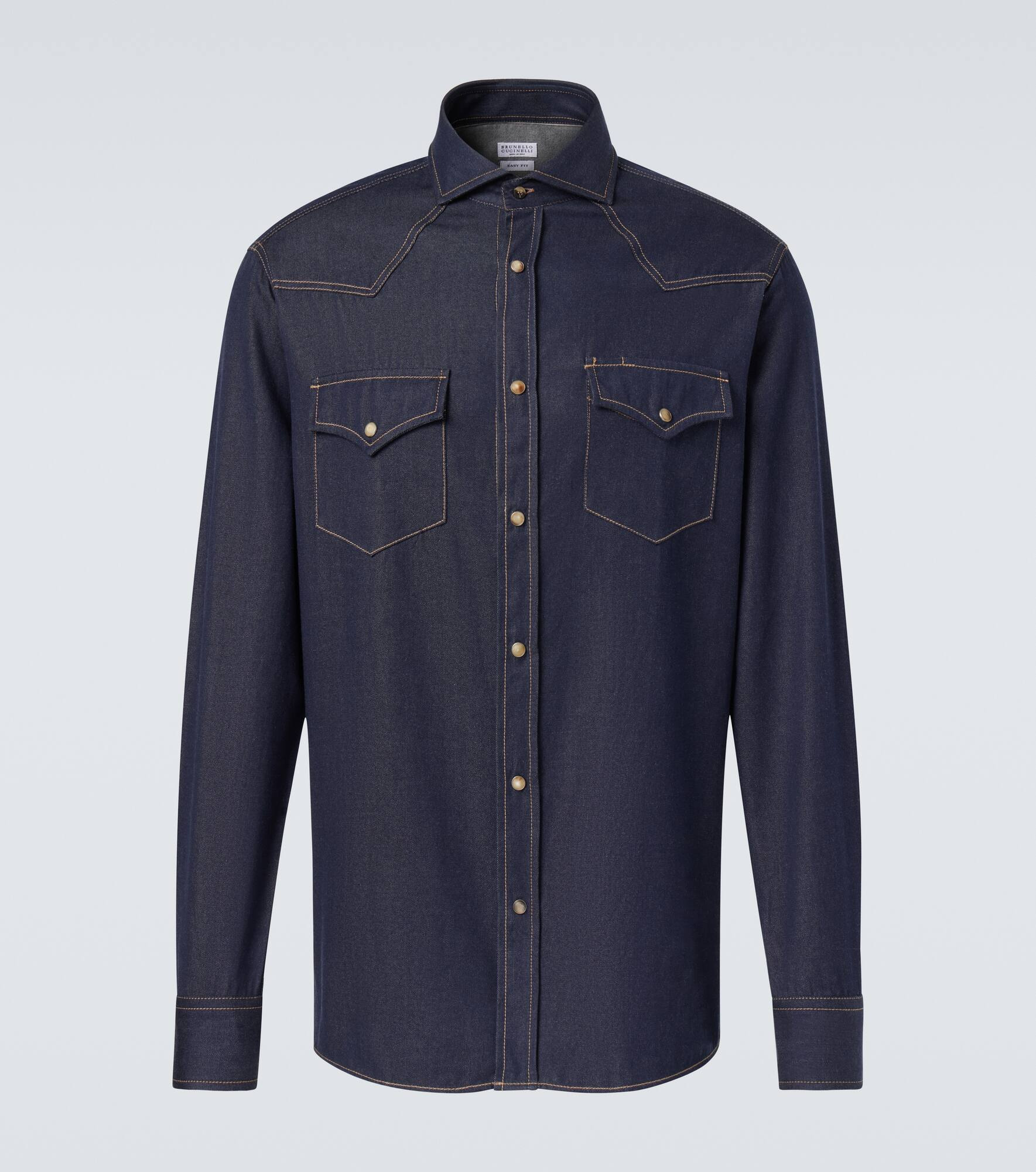 Brunello Cucinelli offers a bold interpretation of a classic with this denim shirt. Cut in a classic silhouette, this style comes in a dark wash with contrasting topstitching, lending a Western-inspired flair to the design. Product Details - Material: 100% cotton - Care instructions: hand wash - Made in Italy - Designer color name: Cjz29 - Item color: blue - Contains non-textile parts of animal origin - Closure: snap-buttoned fastenings - Pockets: flap chest pockets - Item number: P01056029 Size & Fit - True to size - Without pleats in the back - Regular fit - Non-stretchy fabric - Falls to the hip - Height of model is 189cm-74.5" and wears a size L