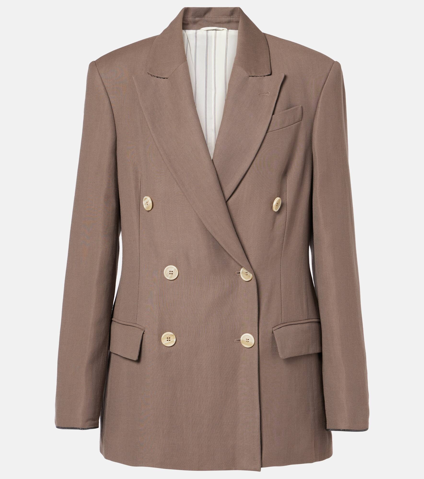 Product Details - Material: 73% viscose, 27% linen - Care instructions: dry clean - Made in Italy - Designer color name: Cacao - Lining: 57% viscose, 43% polyester - Closure: double-breasted (six buttons) - Pockets: flap pockets - Cuff: four buttons - Fully lined - Item number: P01015996 Size & Fit - True to size - Shoulder pad inserts - Straight fit - Non-stretchy fabric - Falls to the hip - The model seen in the picture is 178cm-5'10" and wearing a size IT 40