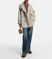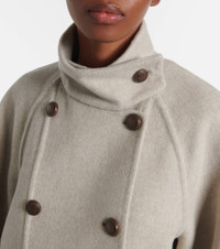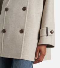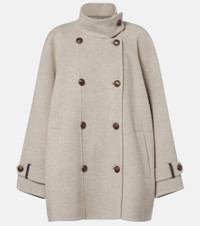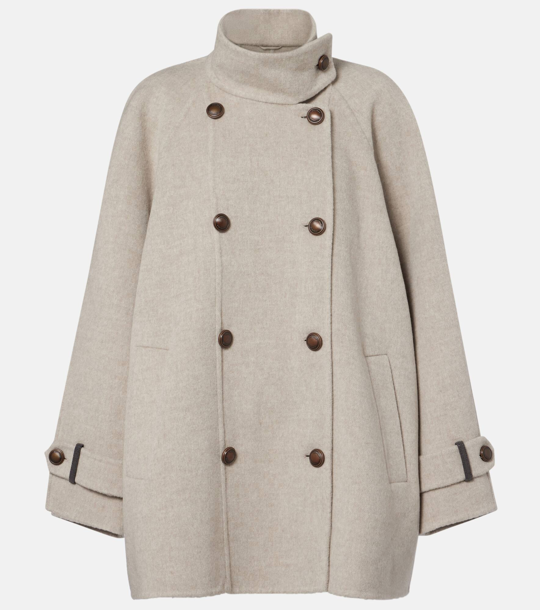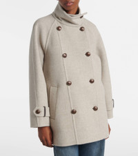 Brunello Cucinelli's designs are created in Solomeo, a hamlet whose art and traditions are woven into the house's every fiber. This double-breasted coat is crafted from wool and cashmere and boasts a buttoned high neck for added warmth. Product Details - Material: 90% wool, 10% cashmere - Care instructions: dry clean - Made in Italy - Designer color name: Light Beige - Item color: beige - Pocket lining: 74% acetate, 26% silk - Details: 100% brass - Contains non-textile parts of animal origin - Closure: double-breasted (six buttons) - Cuff: strap, buckle and loops - Pockets: welt pockets - Unlined - Item number: P01083536 Size & Fit - True to size - Designed for a loose fit - Non-stretchy fabric - Falls below the hip - The model seen in the picture is 178cm-5'10" and wearing a size IT 40