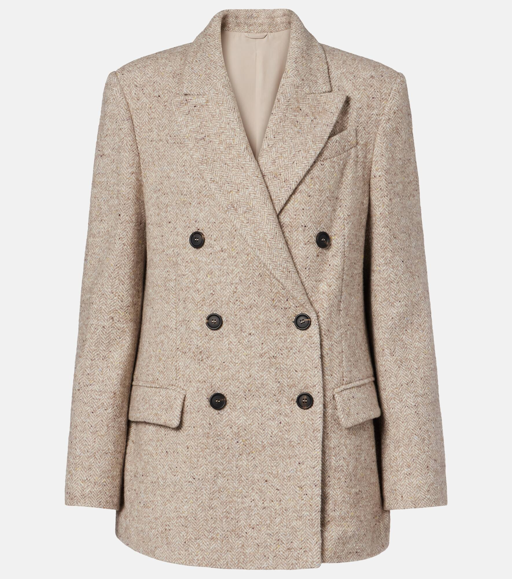Brunello Cucinelli's designs are created in Solomeo, a medieval hamlet whose art and traditions are woven into the house's every fiber. Crafted from a wool and silk-blend with double-breasted closure, this design features the brand's signature Monili beading. Product Details - Material: 73% wool, 22% silk, 5% polyamide - Care instructions: dry clean - Made in Italy - Designer color name: Beige Freddo/Panama - Item color: beige - Lining: 74% acetate, 26% silk - Sleeve lining: 65% acetate, 35% polyester - Details: 100% brass - Contains non-textile parts of animal origin - Blazer - Closure: double-breasted (six buttons) - Pockets: flap pockets - Peak lapel - Vent: single - Item number: P01091814 Size & Fit - True to size - Shoulder pad inserts - Cinched waist - Non-stretchy fabric - Falls below the hip - Height of model is 175cm-69" and wears a size IT 40