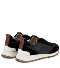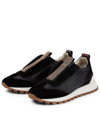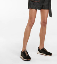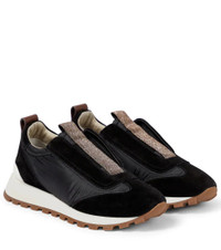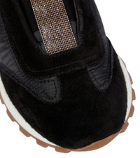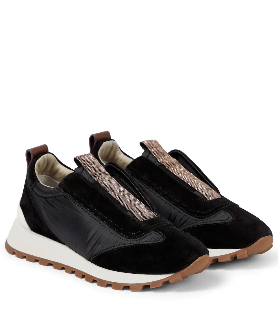 These slip-on sneakers from Brunello Cucinelli are detailed by hand-applied monili beads at the tongues for a futuristic twist. The black pair is made with panels of suede and padded fabric along the uppers. Product Details - Upper: cow leather - Toe shape: round toe - Sole: fabric insole, rubber sole - Comes with a box - Lining: fabric - Designer color name: Black - Made in Italy - Comes with dust bag - Closure: elasticated strap - Trim: fabric - Item number: P00644222 Size & Fit - Fits slightly large to size - we recommend trying a half size smaller - European sizes - 2cm-1" platform (size EU 38) - 3,5cm-1.5" wedge heel (size EU 38)