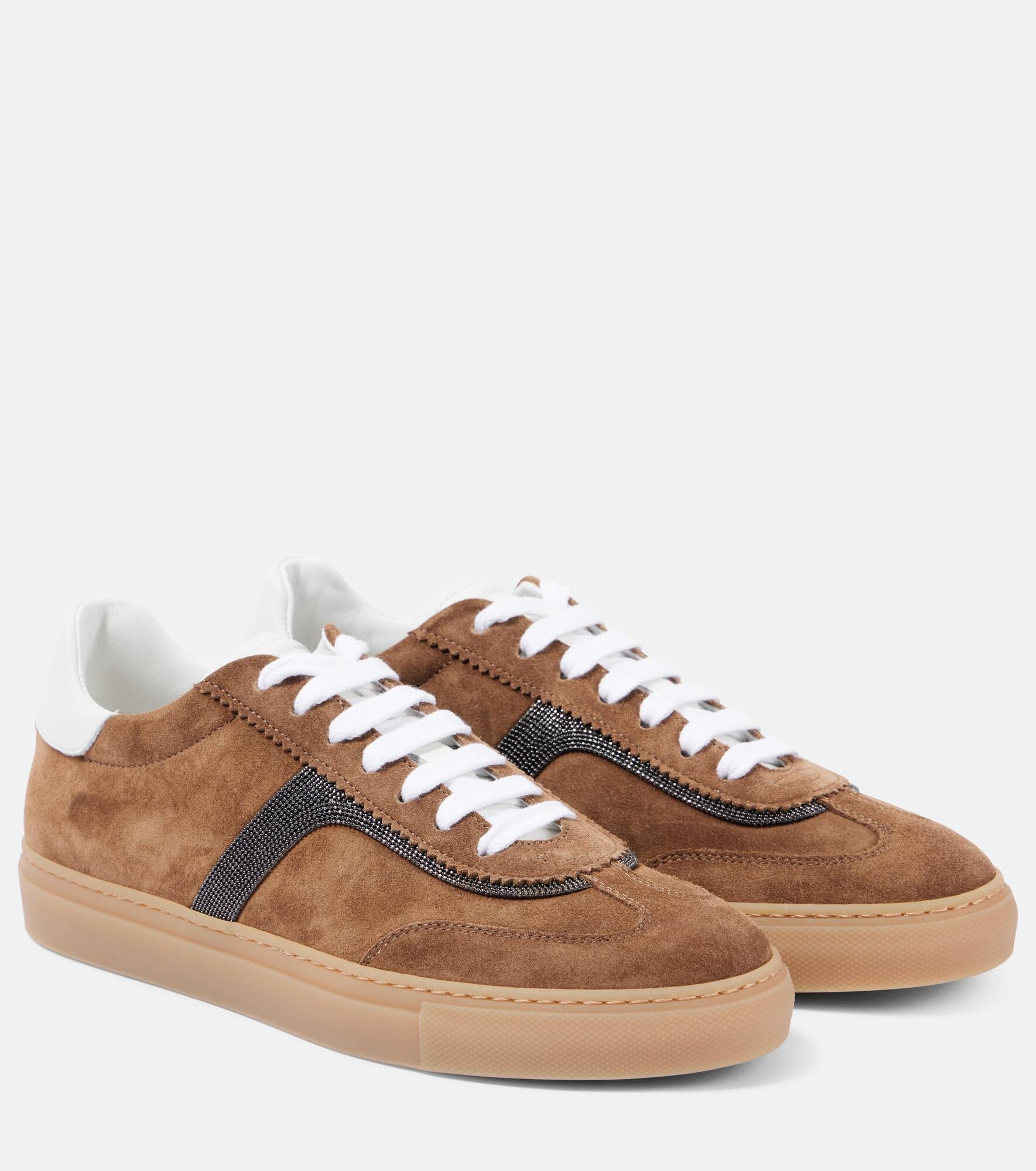 Bead-embellished leather-trimmed suede sneakers Tan