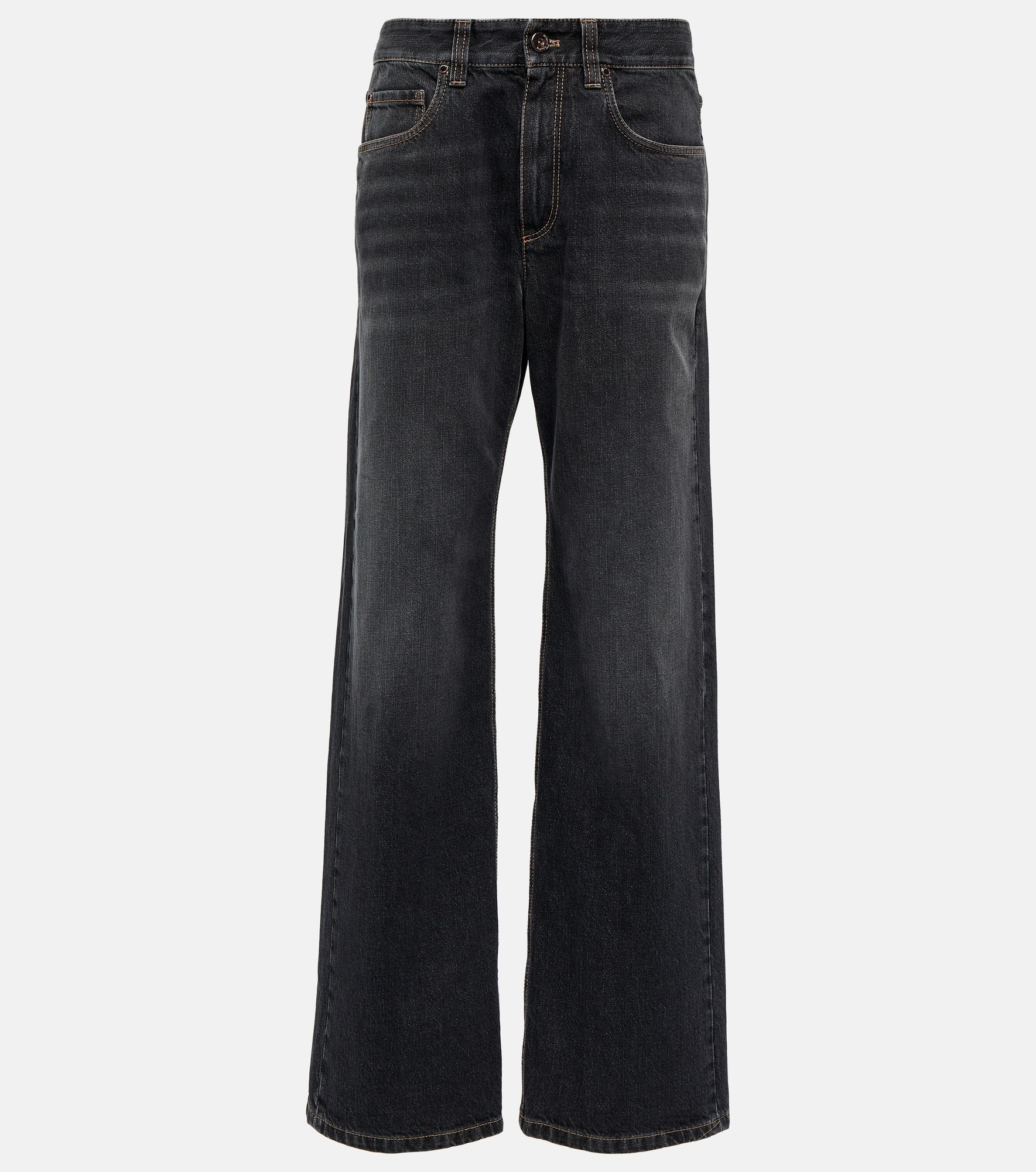 These jeans from Brunello Cucinelli are a simple yet refined staple. Made from cotton with a vintage feel, the high-rise style features a relaxed and loose silhouette with the signature monili-embellished label on the back pocket Product Details - Pockets: five pockets - Belt loops - Made in Italy - Care instructions: machine wash at 30 degrees - Closure: zipper fly, button fastening - Material: 100% cotton - Item number: P00822215 Size & Fit - Fits large to size - we recommend trying one size smaller - Mid-weight material - Non-stretchy fabric - Wide-leg - High-rise - The model seen in the picture is 178cm-5'10" and wearing a size IT 38