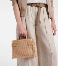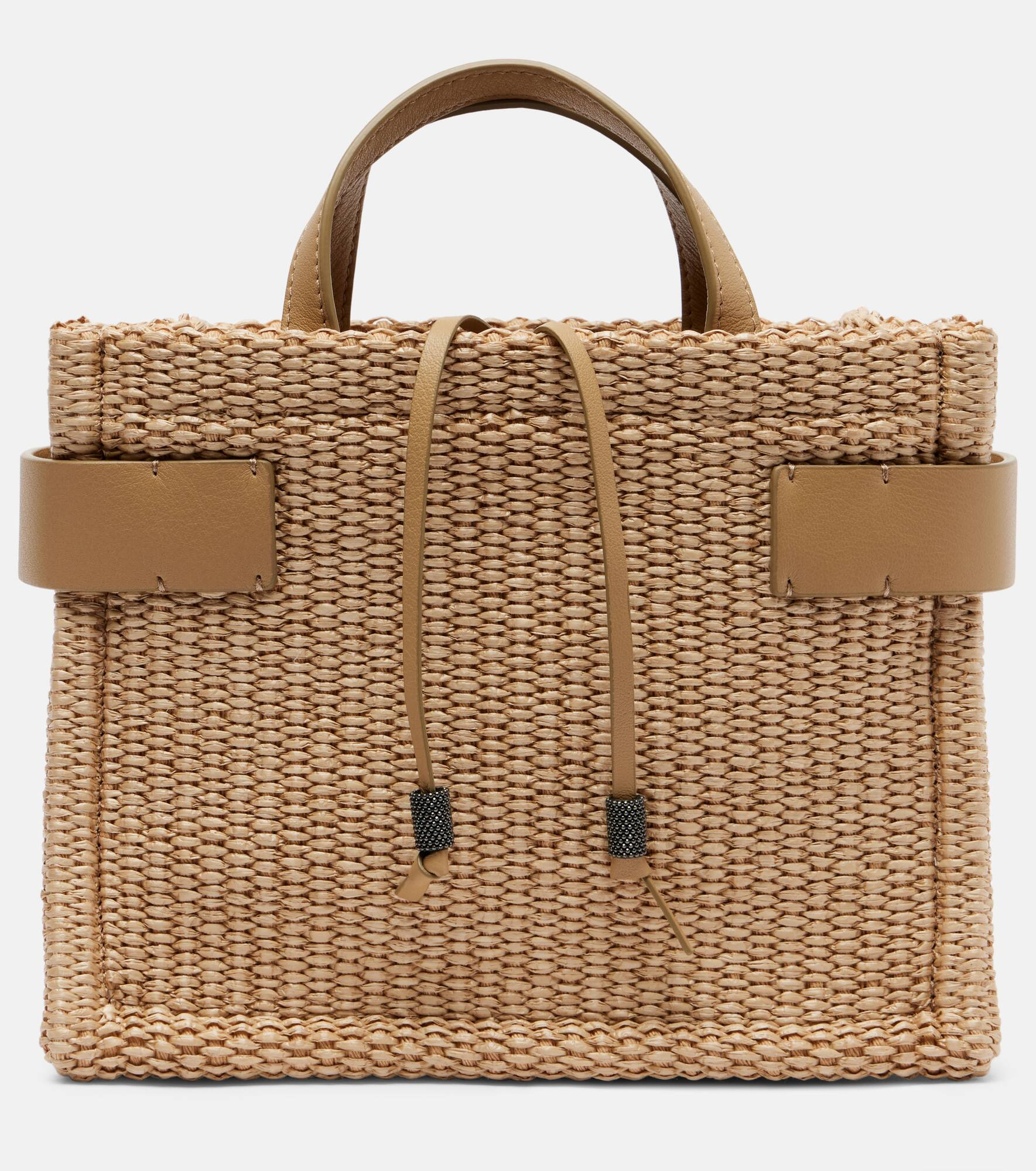 The Essence Large tote bag by Brunello Cucinelli is crafted in Italy from raffia and features leather details. This piece comes with a detachable shoulder strap and a self-tie closure embellished with signature Monili beading. Product Details - Material: raffia, leather - Lining: raffia, leather - Made in Italy - Designer color name: Corda - Item color: beige - Top handles, Detachable, adjustable shoulder strap - Closure: self-tie closure - Internal details: single compartment - Detachable zipped pouch - Includes: dust bag - Item number: P01038027 Size & Fit - Height 17cm-6.5" - Width 22cm-8.5" - Depth 10cm-4" - Length of handle 18cm-7" - Min. length shoulder strap 98cm-38.5" - Max. length shoulder strap 114cm-45" - Clutch height 10cm-4" - Clutch width 12cm-4.5"