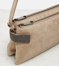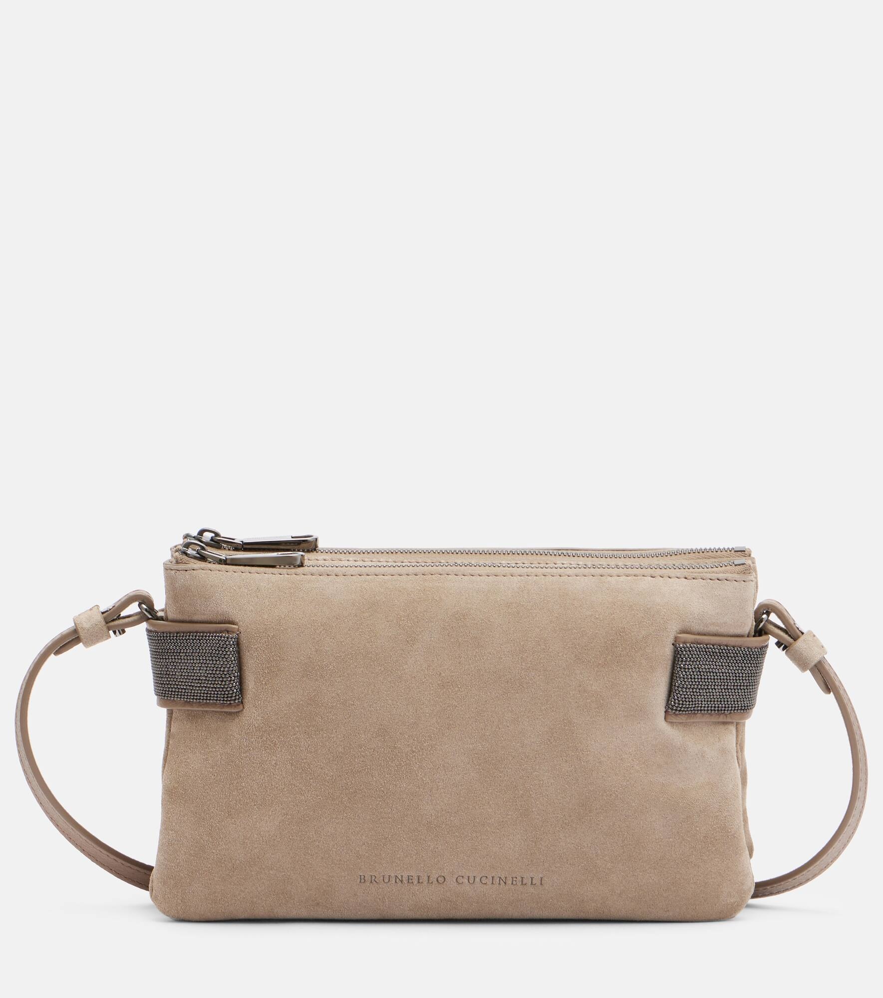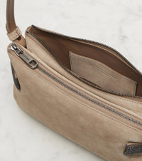 Brunello Cucinelli's designs are created in Solomeo, a medieval hamlet whose art and traditions are woven into the house's every fiber. Expertly crafted from suede, the Essence Small shoulder bag features two zipped compartments and signature Monili embellishments. Product Details - Material: leather (suede) - Lining: leather - Made in Italy - Designer color name: Ice - Item color: beige - Includes: dust bag - Adjustable shoulder strap - Item number: P01037905 Size & Fit - Height 13cm-5" - Width 21,5cm-8.5" - Depth %cm%cm-0.1" - Adjustable shoulder strap - Max. length shoulder strap 114cm-45"