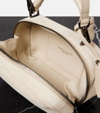 Brunello Cucinelli's designs are created in Solomeo, a medieval hamlet whose art and traditions are woven into the house's every fiber. The Foulard Mini tote bag is crafted from supple suede with structured straps and a zipped top. Product Details - Material: leather (suede) - Lining: leather - Made in Italy - Designer color name: Avorio - Item color: white - Closure: two-way zipped top - Top handle, Detachable, adjustable shoulder strap - Item number: P01013137 Size & Fit - Height 11,5cm-4.5" - Width 19,5cm-7.5" - Depth 7,5cm-3" - Length of handle 20cm-8" - Adjustable shoulder strap - Min. length shoulder strap 97cm-38" - Max. length shoulder strap 113cm-44.5"