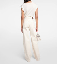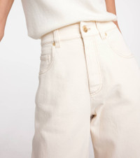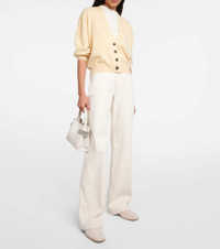 Product Details - Material: 98% cotton, 2% elastane - Care instructions: machine wash at 30 degrees - Made in Italy - Designer color name: Ecru - Pockets: five pockets - Closure: zipper fly, button fastening - Lining: 100% cotton - Contains non-textile parts of animal origin - Details: 100% leather - Item number: P00903076 Size & Fit - True to size - Non-stretchy fabric - Wide-leg - High-rise - The model seen in the picture is 178cm-5'10" and wearing a size IT 40