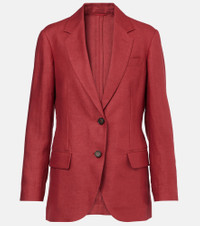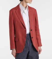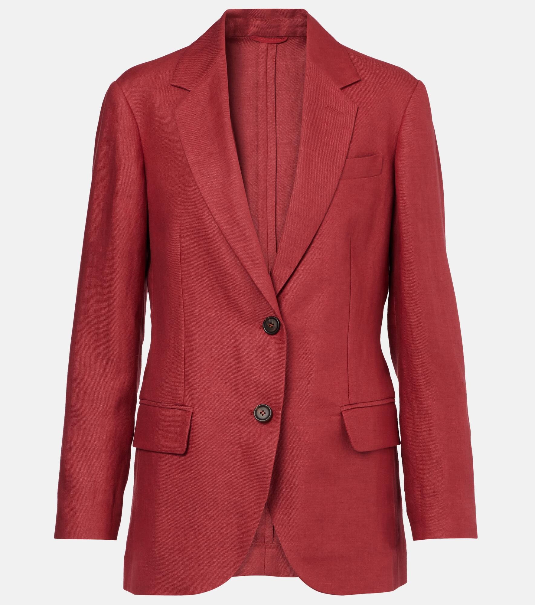 Product Details - Material: 53% hemp, 47% linen - Care instructions: dry clean - Made in Italy - Designer color name: Rosso - Item color: red - Closure: single-breasted - Pockets: flap pockets - Buttoned cuffs - Sleeve lining: 65% acetate, 35% polyester - Pocket lining: 74% acetate, 26% silk - Details: 100% brass - Contains non-textile parts of animal origin - Item number: P01016083 Size & Fit - True to size - Straight fit - Adjustable at the waist - Non-stretchy fabric - Falls to the hip - The model seen in the picture is 178cm-5'10" and wearing a size IT 40