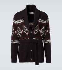 Brunello Cucinelli blends Italian craftsmanship with a refined, contemporary aesthetic across thoughtfully designed wardrobe staples. This jacquard cardigan is made in Italy with a blend of wool, silk, and cashmere. The design has a detachable belt. Product Details - Material: 70% wool, 22% silk, 8% cashmere - Care instructions: hand wash - Made in Italy - Designer color name: Burgundy Black - Item color: black, multicolor - Material II: 36% alpaca wool, 25% polyamide, 13% wool, 13% silk, 10% cotton, 3% viscose - Closure: buttoned front - Pockets: welt pockets - Detachable belt - Item number: P01095096 Size & Fit - True to size - Loose fit, comes with belt - Slightly stretchy fabric - Falls below the hip - Height of model is 187cm-73.5" and wears a size IT 50