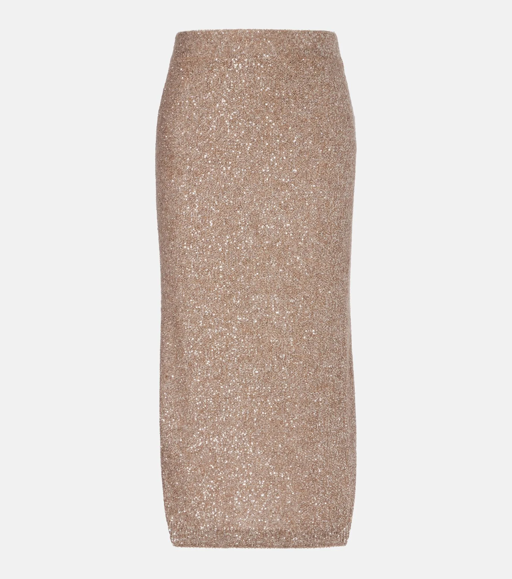 Brunello Cucinelli's designs are created in Solomeo, a medieval hamlet whose art and traditions are woven into the house's every fiber. This pencil skirt is crafted from shimmering lame and shaped into a figure-hugging silhouette. Product Details - Material: 52% polyamide, 37% polyester, 11% mohair - Care instructions: hand wash - Made in Italy - Color: beige - Designer color name: Brown Caldo+Brown Scuro - Material II: 100% polyester - Material III: 74% acetate, 26% silk - Elasticated waistband - Hem: ribbed - Item number: P01143605 Size & Fit - True to size - Elasticated waist - Partly stretchy fabric - High-waisted - The model seen in the picture is 178cm-5'10" and wearing a size XS