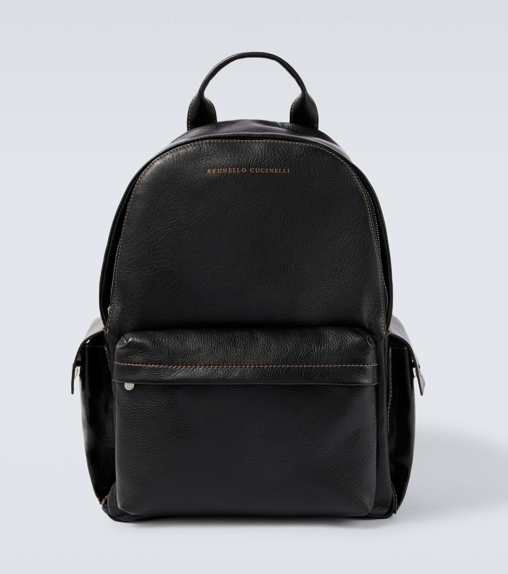 Crafted in Italy with meticulous attention to detail, this Brunello Cucinelli leather backpack adds a touch of luxury to your travels. Multiple compartments keep essentials organized, while adjustable shoulder straps enhance comfort and versatility. Product Details - Material: calf leather - Lining: fabric - Made in Italy - Designer color name: Black - Item color: black - Closure: zipped top - Internal details: internal slot pocket, internal zipped pocket - Top handle, Adjustable shoulder straps - Item number: P01056099 Size & Fit - Height 43cm-17" - Width 32cm-12.5" - Depth 16cm-6.5" - Length of handles 26cm-10" - Adjustable shoulder strap - Max. length shoulder strap 85cm-33.5"