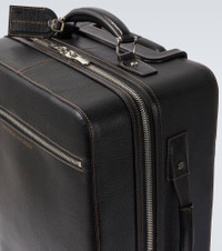 Brunello Cucinelli's lifestyle designs are meticulously crafted with the same attention to detail as the Maison's garments. Case on point, this carry-on suitcase is cut from grained calf leather, secured with practical zippers, and finished with logo lettering at the front. Product Details - Material: calf leather - Lining: fabric - Made in Italy - Designer color name: Black - Item color: black - Internal details: internal zipped pocket, centre slot compartment - Closure: two-way zipped top - Telescopic handle with adjustable length, Top handle - Front pocket - Detachable address tag - Includes: dust bag - Item number: P01056162 Size & Fit - Height 50cm-19.5" - Width 37.5cm-15" - Depth 23cm-9" - Clutch height 35cm-14" - Clutch width 23cm-9"