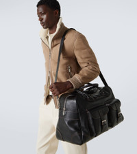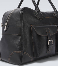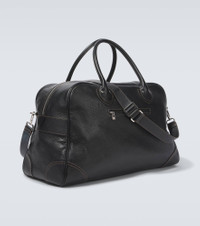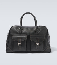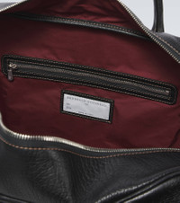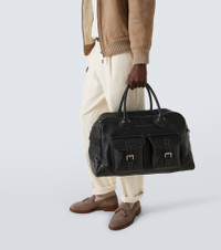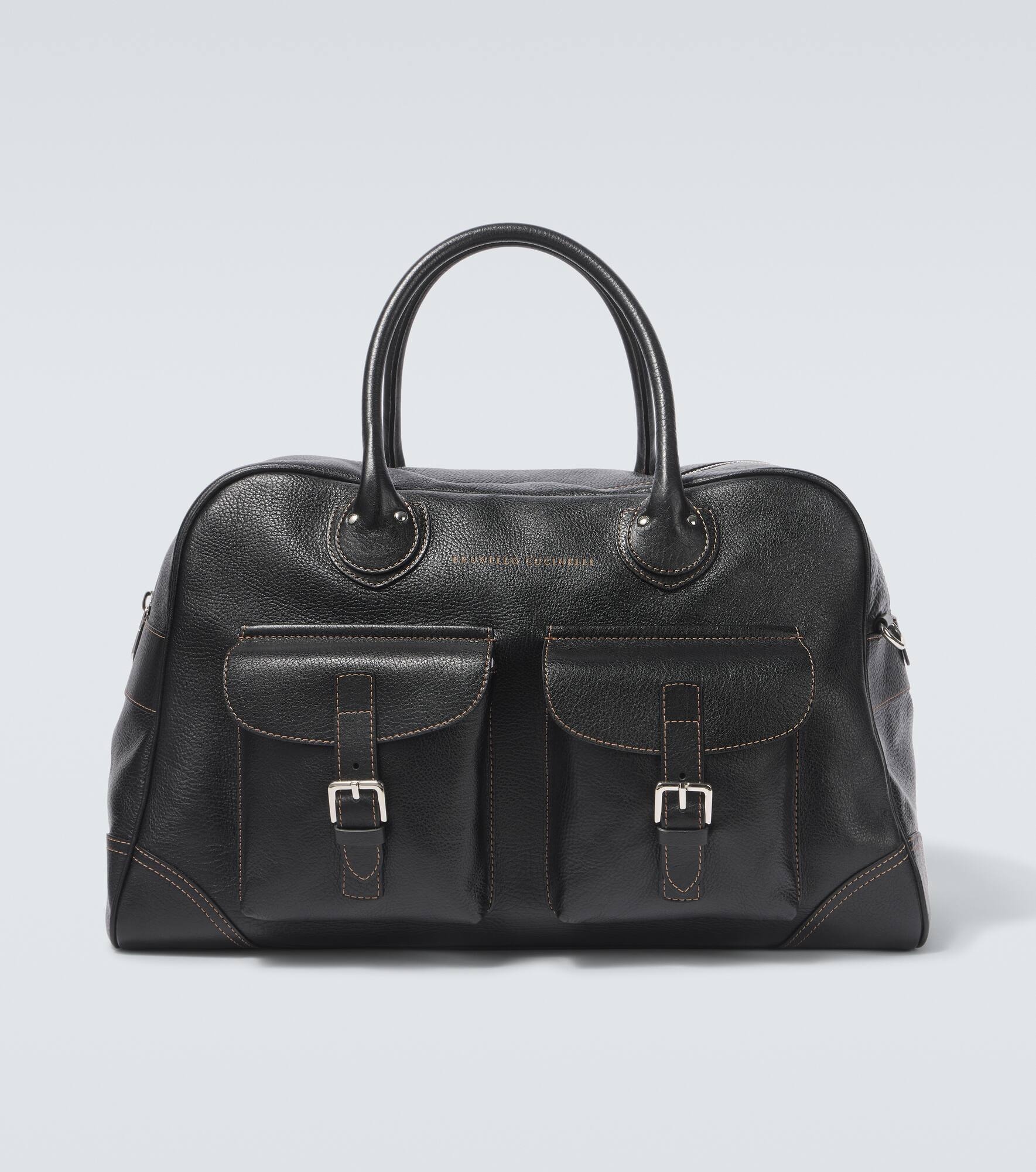 Finely crafted in Italy, this supple leather duffle bag by Brunello Cucinelli features multiple pockets for organizing your belongings. Ideal for work or pleasure, this piece will be a pleasure to tote along on all your travels. Product Details - Material: leather - Lining: fabric - Made in Italy - Designer color name: C101 - Item color: black - Closure: zipped top - Detachable shoulder strap - Includes: dust bag - Zipped back pocket - Front pockets - Hardware color: silver - Internal details: internal zipped pocket, internal slot pocket - Item number: P01056097 Size & Fit - Height 31cm-12" - Width 50cm-19.5" - Depth 23cm-9" - Length of handles 50cm-19.5" - Adjustable shoulder strap - Max. length shoulder strap 130cm-51"
