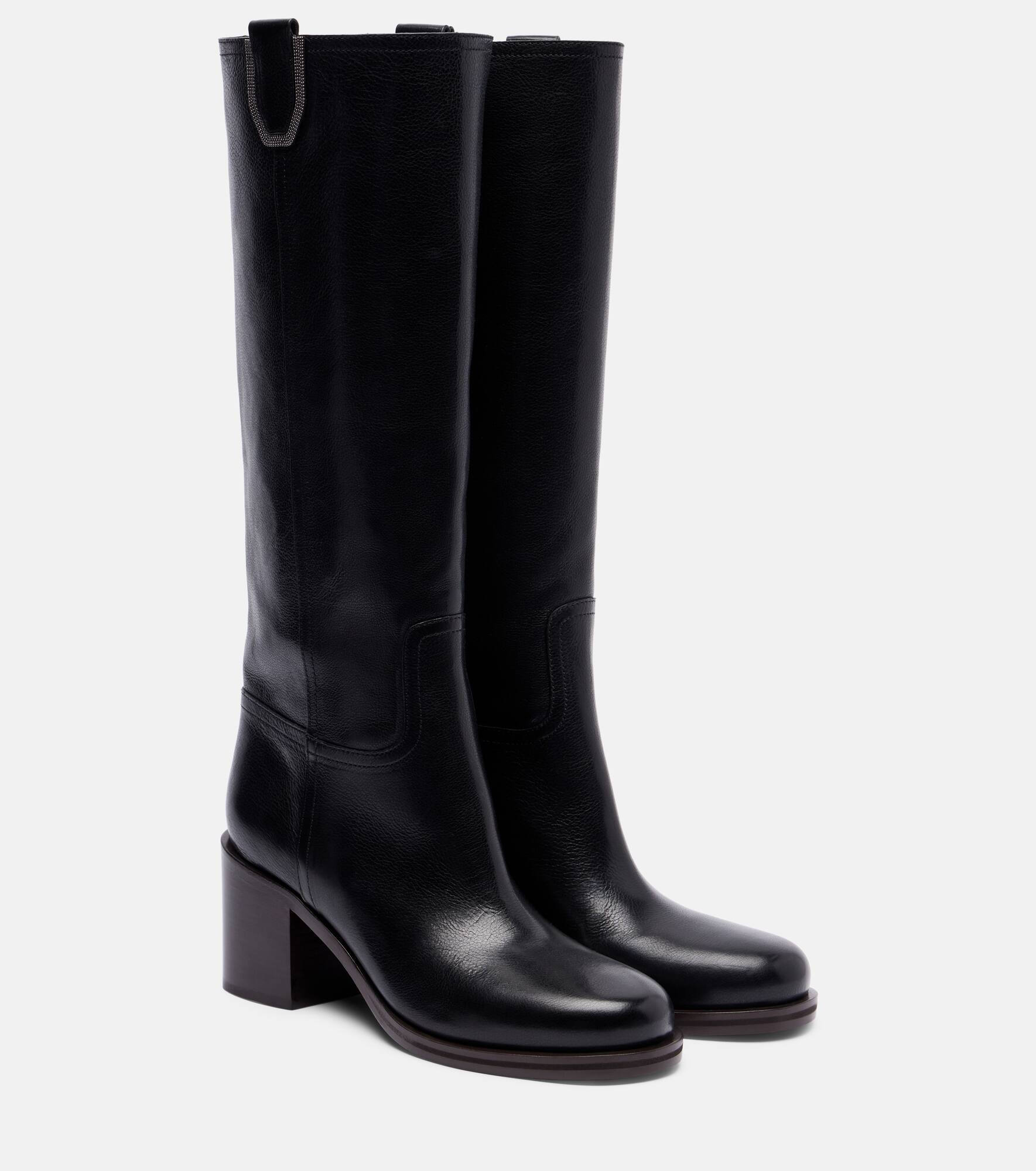 Brunello Cucinelli's designs are created in Solomeo, a medieval hamlet whose art and traditions are woven into the house's every fiber. These leather knee-high boots boast round toe silhouettes and comfortable block heels. Product Details - Upper: leather - Lining: leather - Sole: leather insole and sole - Toe shape: round toe - Made in Italy - Includes: shoe box - Designer color name: Black - Item color: black - Item number: P01083636 Size & Fit - True to size - European sizes - 7,5cm-3" heel (size EU 38) - 37cm-14.5" shaft height (size EU 38) - 37cm-14.5" shaft width (size EU 38) - shaft width measured on largest part of boot