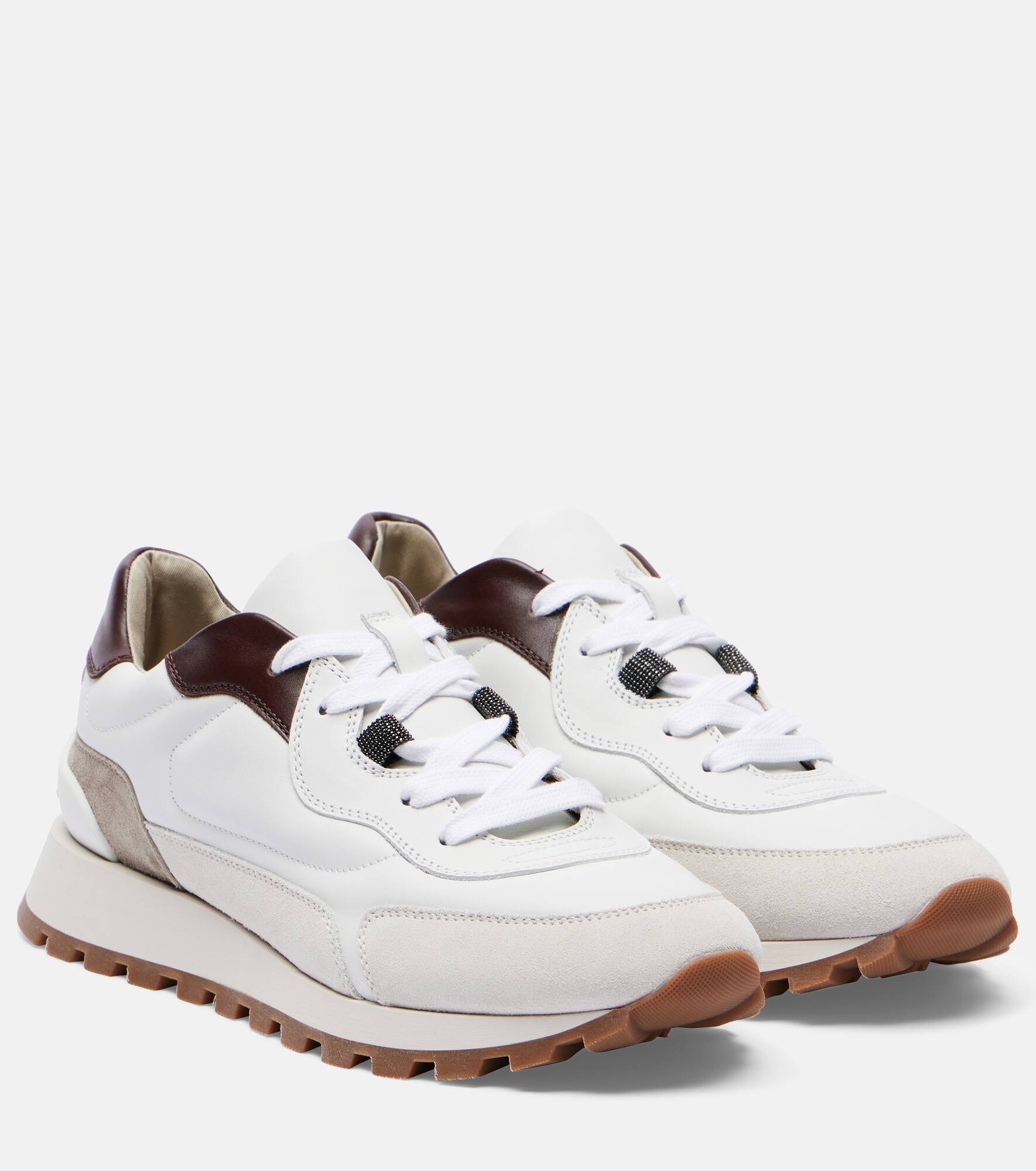 These low-top sneakers from Brunello Cucinelli promise to be a versatile addition to your shoe edit. Made from leather and trimmed with suede at the back, the pair rests on comfortable rubber soles. Product Details - Upper: leather - Lining: fabric - Sole: fabric insole, rubber sole - Toe shape: round toe - Made in Italy - Includes: shoe box, dust bags - Designer color name: White - Item color: white - Contains non-textile parts of animal origin - Item number: P01058348 Size & Fit - True to size - European sizes - 2cm-1" platform (size EU 38) - 3,5cm-1.5" wedge heel (size EU 38)