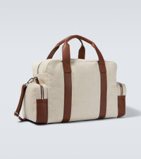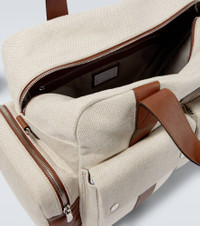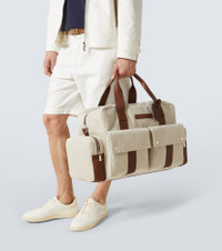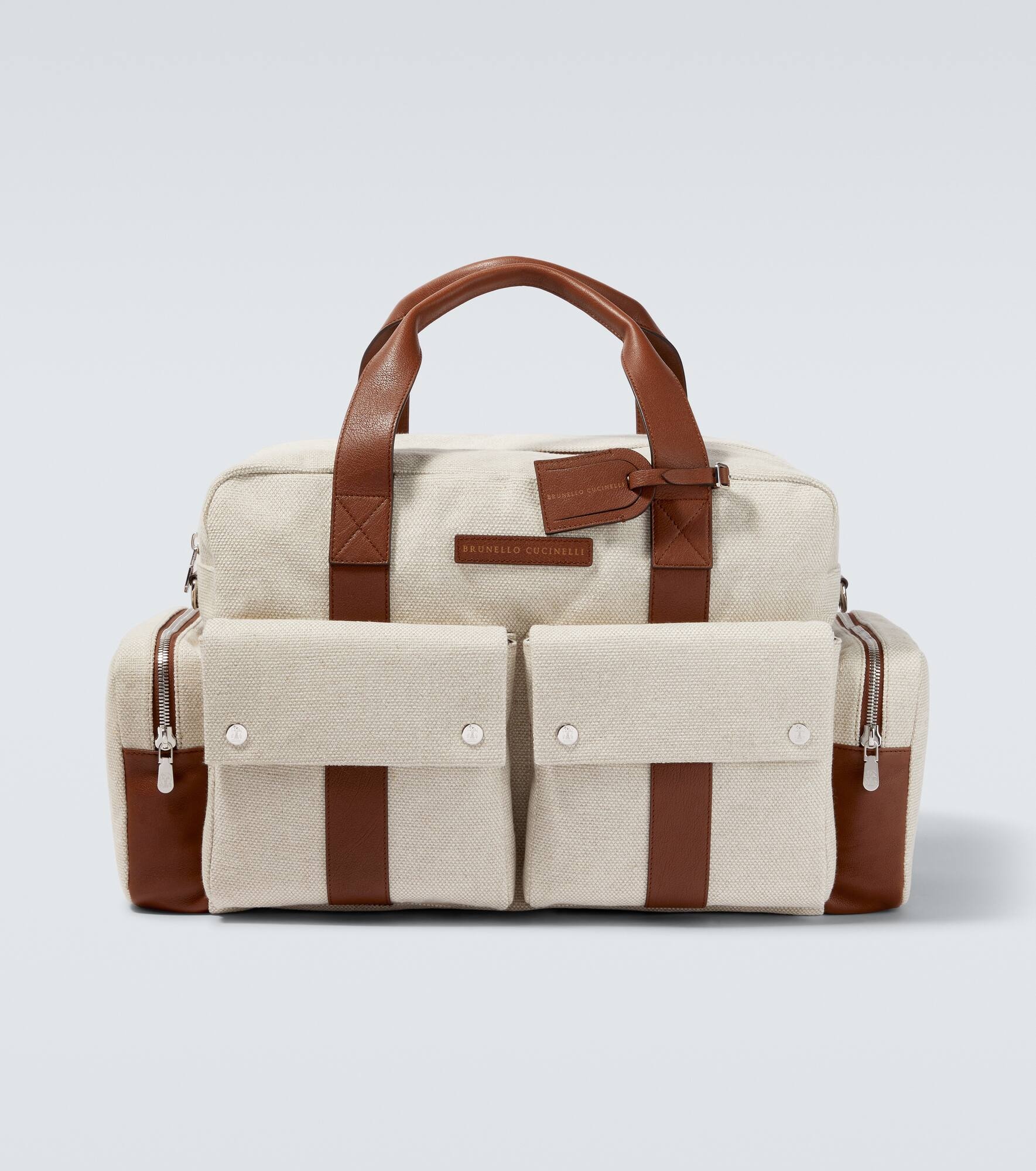 Made from sturdy canvas with polished leather trims, this capacious duffel bag will carry all your essentials in style. Brunello Cucinelli's designs are created in Solomeo, a medieval hamlet whose art and traditions are woven into the house's every fiber. Product Details - Material: fabric - Lining: fabric - Made in Italy - Designer color name: CF533 - Item color: beige - Trim: leather - Closure: zipped top - Top handles, Detachable, adjustable shoulder strap - Internal details: internal zipped pocket, internal slot pockets - Hardware color: silver - Front pockets - Luggage tag - Protective feet - Item number: P01046371 Size & Fit - Height 32cm-12.5" - Width 45cm-17.5" - Depth 23cm-9" - Length of handles 50cm-19.5" - Adjustable shoulder strap - Min. length shoulder strap 81cm-32" - Max. length shoulder strap 110cm-43.5"
