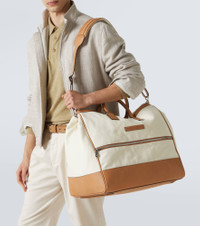 Brunello Cucinelli's designs are created in Solomeo, a medieval hamlet whose art and traditions are woven into the house's every fiber. Finished with smooth leather trims, this capacious duffel bag is expertly Italian-crafted from cotton and linen canvas with multiple, practical compartments and zipped closures. Product Details - Material: fabric - Lining: fabric - Made in Italy - Designer color name: CJ442 White/Brown - Item color: brown, white - Trim: leather - Closure: zipped top - Top handles, Detachable, adjustable shoulder strap - Internal details: internal zipped pocket - Hardware color: silver - Item number: P01046368 Size & Fit - Height 35cm-14" - Width 44cm-17.5" - Depth 30cm-12" - Length of handles 35cm-14" - Adjustable shoulder strap - Min. length shoulder strap 87cm-34.5" - Max. length shoulder strap 118cm-46.5"