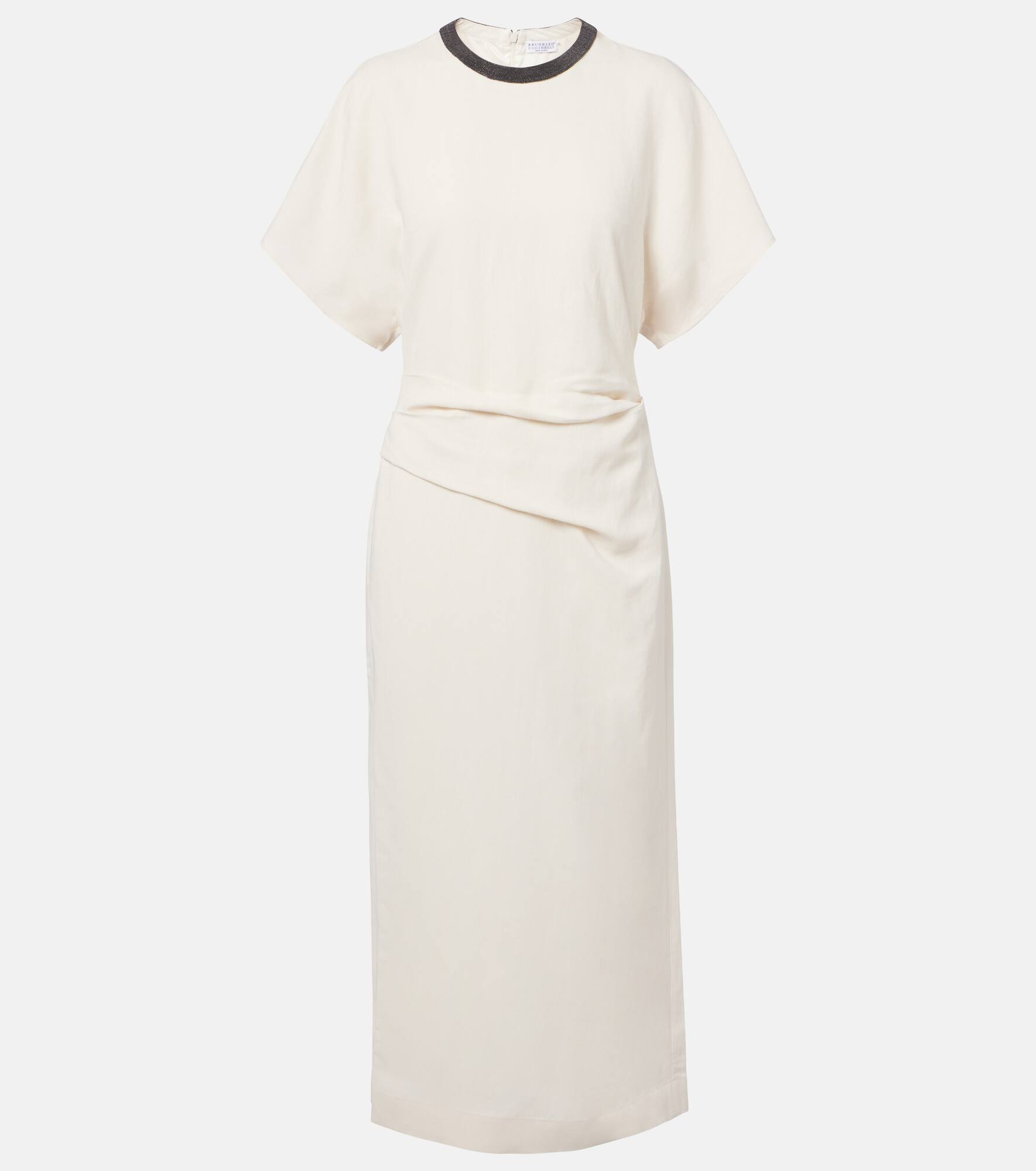 Crafted in Italy from a breathable linen blend, this Brunello Cucinelli midi dress offers comfort without compromising on style. This piece features a contrasting crewneck, an alluring back slit, and an invisible zip closure for a seamless finish. Product Details - Material: 73% viscose, 27% linen - Care instructions: dry clean - Made in Italy - Designer color name: Panna - Item color: white - Details: 100% brass - Lining: 65% acetate, 35% polyester - Closure: zipped back - Short vent - Item number: P01054193 Size & Fit - True to size - Cinched waist - Non-stretchy fabric - slit length 36cm-14" - The model seen in the picture is 178cm-5'10" and wearing a size XS