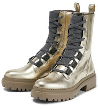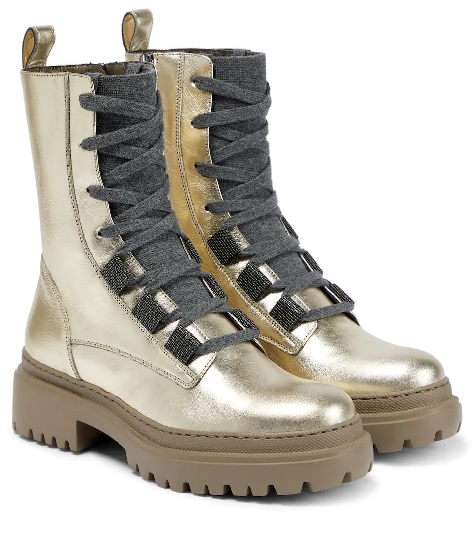 These ankle boots are made from shiny metallic leather with knit trims and embellished lace-ups. A Brunello Cucinelli signature, the monili beading is made from nickel-free brass that's faceted to create a sparkling effect and hand-applied to each item. - upper: calf leather, fabric - lining: leather, fabric - trim: brass - sole: leather insole, rubber sole - lace-up, zipped side - Made in Italy - comes with dust bag - comes with a box - Designer colour name: Platino size & fit - True to size - European sizes - 5,5cm-2" heel (size EU 38) - 4cm-1.5" platform (size EU 38)
