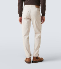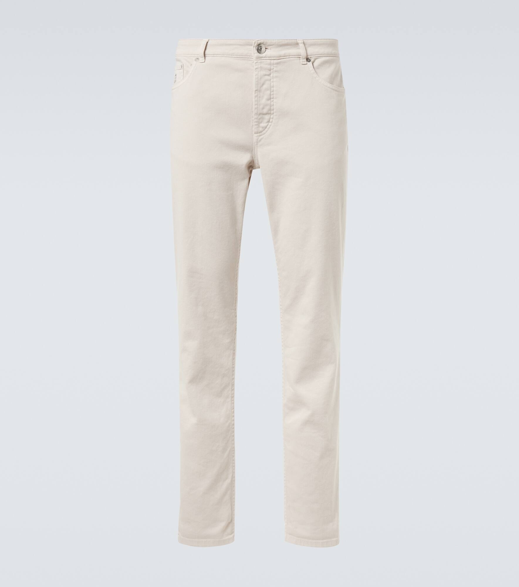 Crafted in Italy, these Brunello Cucinelli mid-rise slim jeans blend everyday comfort with sophistication. Featuring a classic five-pocket design and concealed button closure, this pair offers a refined take on casual style. Product Details - Material: 99% cotton, 1% elastane - Care instructions: machine wash at 30 degrees - Made in Italy - Designer color name: C7024 - Item color: beige - Details: 100% leather - Lining: 100% cotton - Lining II: 58% cotton, 42% polyester - Hardware color: silver - Contains non-textile parts of animal origin - Closure: concealed button placket - Pockets: five pockets - Belt loops - Item number: P01056073 Size & Fit - True to size - Slightly stretchy fabric - Straight leg - Mid-rise - Height of model is 189cm-74.5" and wears a size 50