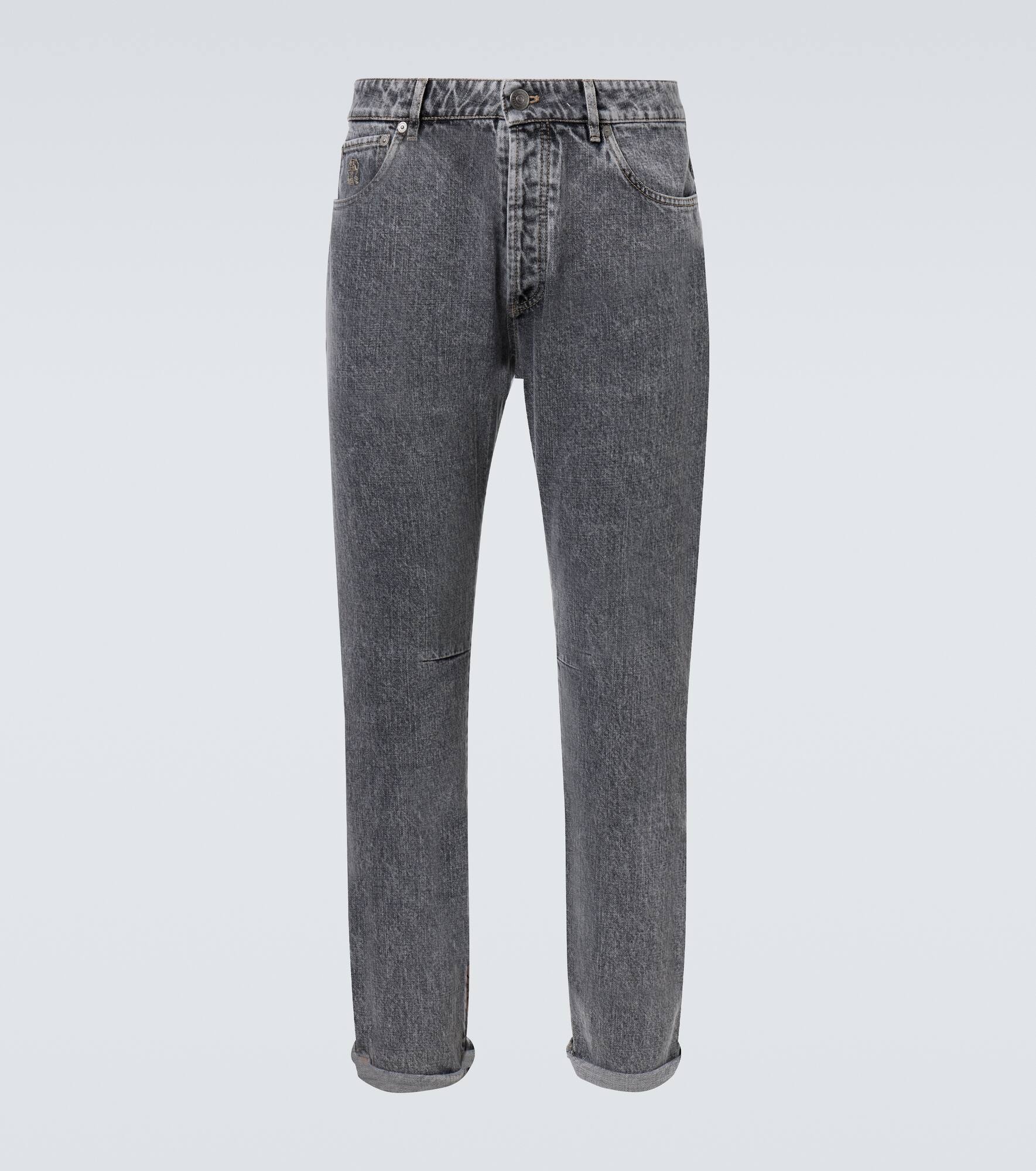 Brunello Cucinelli instills high-quality craftsmanship even into the most casual designs like these classic jeans. Cut in a slim silhouette, this style features an impeccably crafted 5-pockets construction. Product Details - Material: 100% cotton - Care instructions: machine wash at 30 degrees - Made in Italy - Designer color name: C9015 - Item color: gray - Trim: 100% leather (suede) - Lining: 100% cotton - Contains non-textile parts of animal origin - Closure: concealed button placket - Pockets: five pockets - Belt loops - Item number: P01056068 Size & Fit - True to size - Non-stretchy fabric - Slim-leg - Mid-rise - Height of model is 189cm-74.5" and wears a size 50