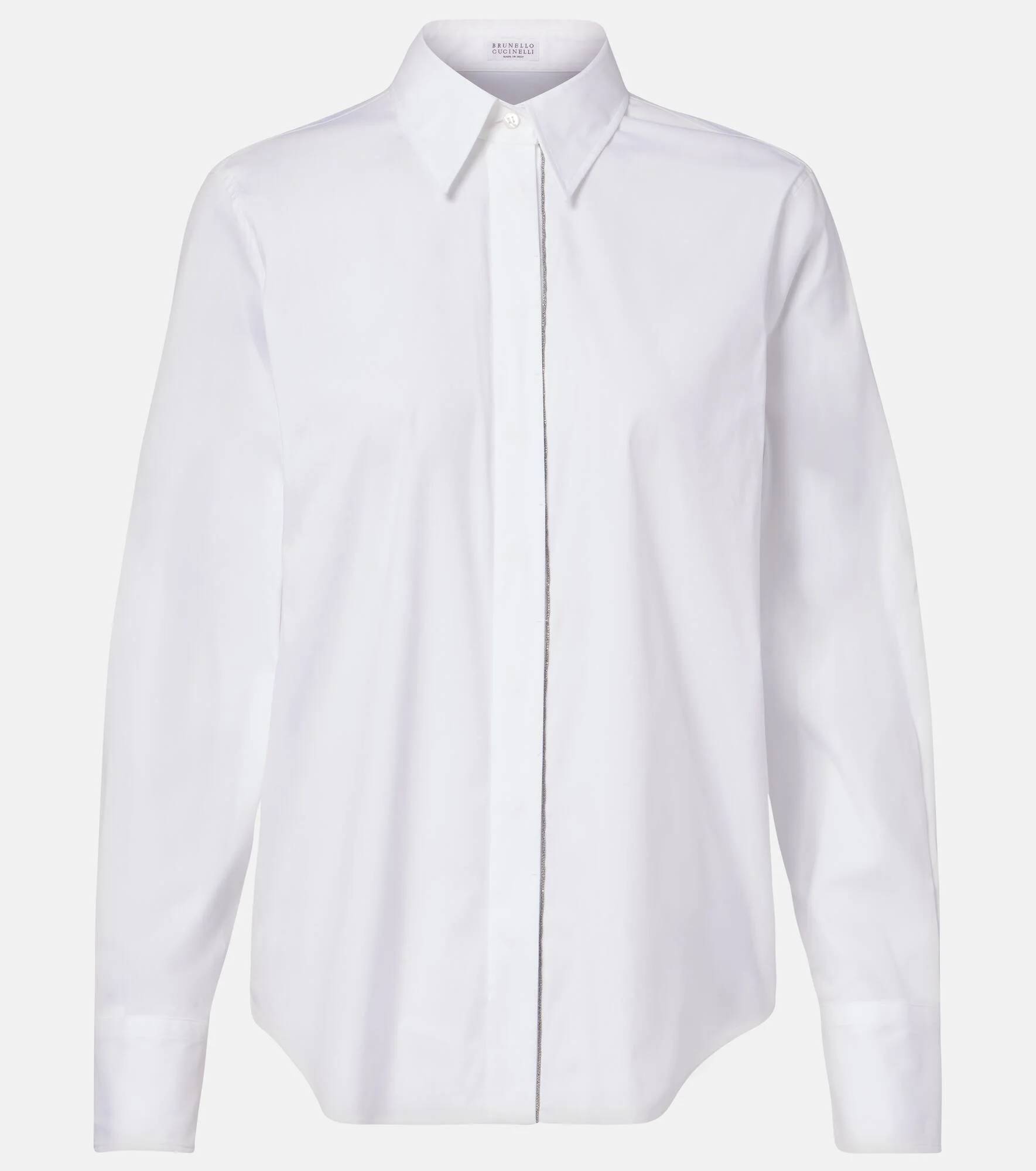 A Brunello Cucinelli signature, monili beading is made from nickel-free brass that's faceted to create a sparkling effect and hand-applied to each item. The iconic embellishment borders the placket of this shirt, made in Italy from cotton-blend poplin. Product Details - Material: 72% cotton, 23% polyamide, 5% elastane - Care instructions: machine wash at 30 degrees - Made in Italy - Designer color name: White - Item color: white - Details: 100% brass - Contains non-textile parts of animal origin - Collar: classic (Straight point) - Cuff: buttoned - Closure: buttoned placket - Item number: P01143494 Size & Fit - True to size - Straight fit - Stretchy fabric - Falls below the hip - The model seen in the picture is 178cm-5'10" and wearing a size XS