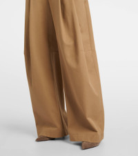 Brunello Cucinelli's wide-leg pants are a modern take on a classic tailored style. They are made from soft cotton with relaxed legs and feature double pleats on the front for a polished touch. Product Details - Material: 100% cotton - Care instructions: dry clean - Made in Italy - Designer color name: Camel - Lining: 36% polyester, 32% acetate, 32% cupro - Embroidery: 100% brass - Pockets: side slit pockets, back pockets - Closure: zip and button fastening - Double pleat - Fit: wide-leg - Full length - Hem: finished - Belt loops - Item number: P01041549 Size & Fit - Fits large to size - we recommend trying one size smaller - Non-stretchy fabric - Wide-leg - High-waisted - Height of model is 180cm-71" and wears a size IT 38