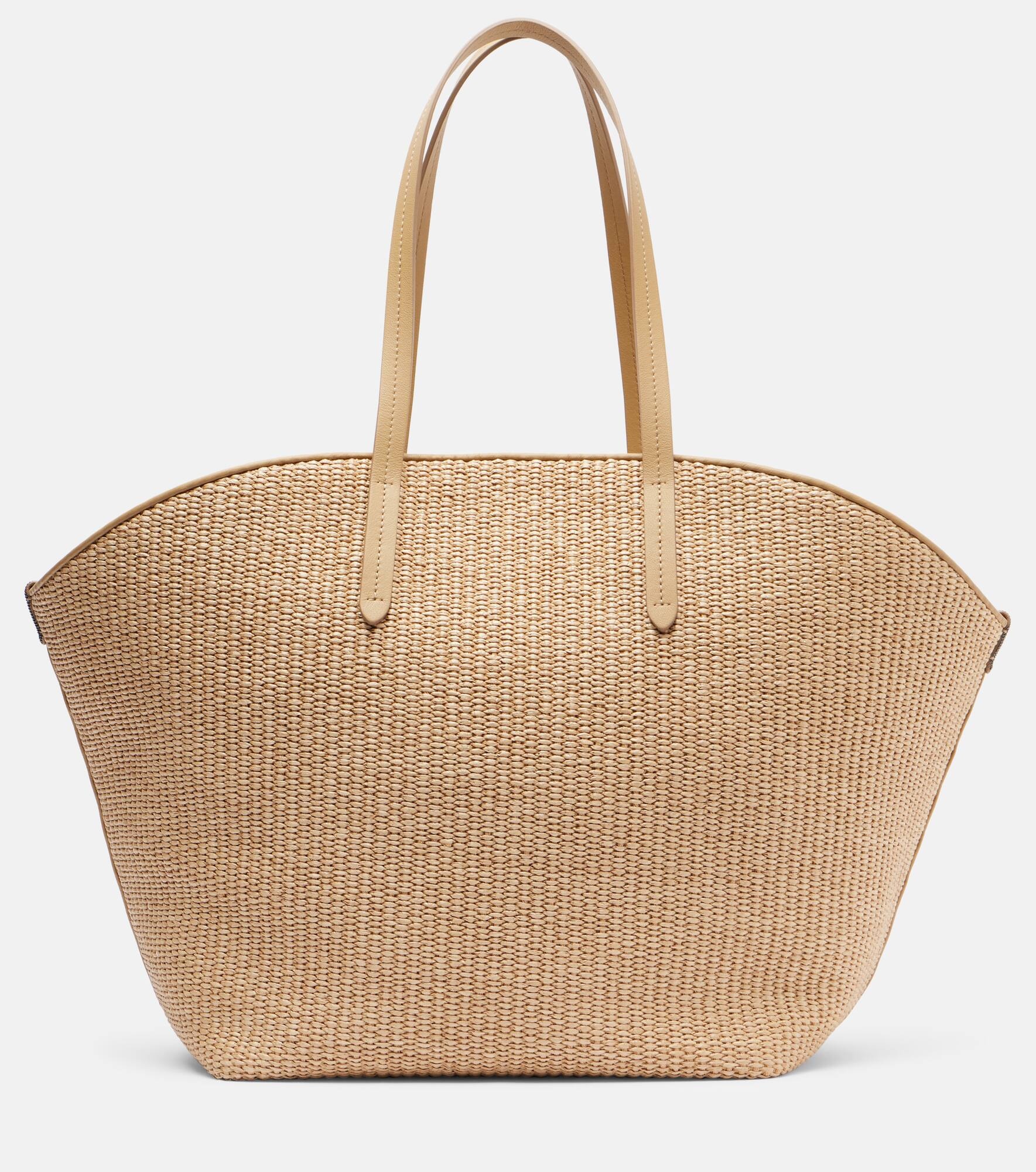 This rafia-effect basket bag from Brunello Cucinelli boasts the unmistakable monili beading on the sides. Crafted in Italy with a leather trim, this piece features a magnetic fastening and an internal zipped pocket. Product Details - Material: fabric, leather - Lining: fabric - Made in Italy - Designer color name: Corda - Item color: beige - Top handles - Internal details: internal zipped pocket - Includes: dust bag - Item number: P01037889 Size & Fit - Height 32cm-12.5" - Width 53cm-21" - Depth 18cm-7" - Length of handles 56cm-22"
