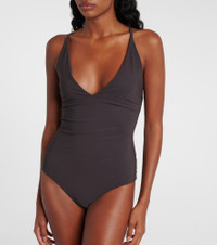 This swimsuit from Brunello Cucinelli showcases a deep V-neckline and an alluring open back. Signature Monili detailing on the straps lends the design an additional, dazzling touch. Product Details - Material: 68% polyamide, 32% elastane - Care instructions: hand wash - Made in Italy - Designer color name: Marrone - Embroidery: 100% brass - Lining: 74% polyamide, 27% elastane - Item number: P01041505