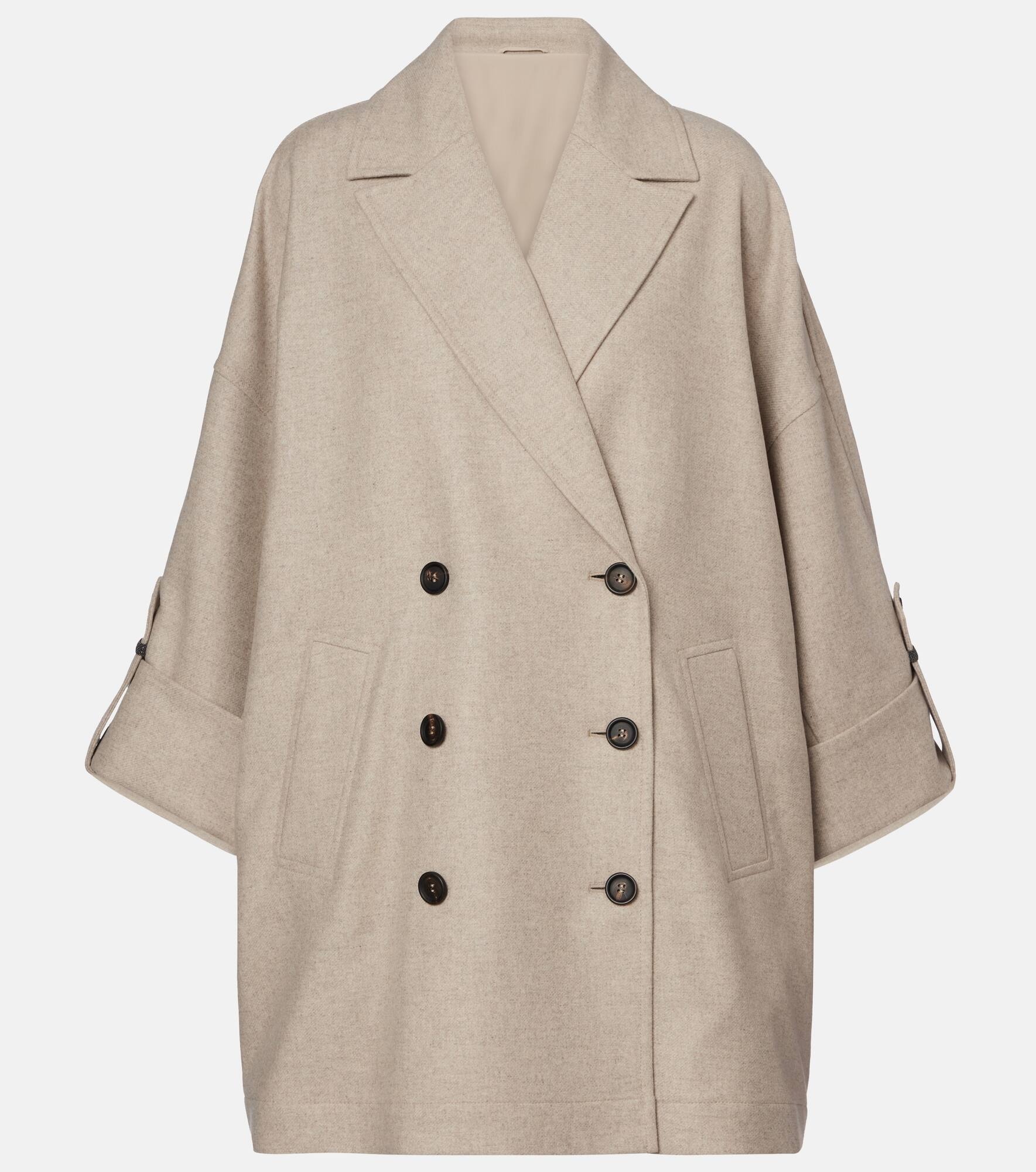 This jacket from Brunello Cucinelli combines the elegance of a double-breasted silhouette with dropped shoulders and an oversized fit. Crafted from sumptuous beige wool, this unique jacket is a refined outerwear piece. Product Details - Material: 98% wool, 2% other fibres - Care instructions: dry clean - Made in Italy - Designer color name: Beige - Item color: beige - Lining: 74% acetate, 26% silk - Contains non-textile parts of animal origin - Pockets: welt pockets - Collar: notch neck - Closure: double-breasted (six buttons) - Includes: garment bag - Item number: P01054361 Size & Fit - True to size - Oversized - Non-stretchy fabric - Falls below the hip - The model seen in the picture is 178cm-5'10" and wearing a size IT 40