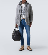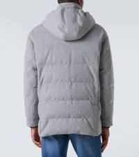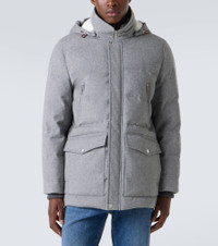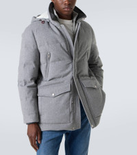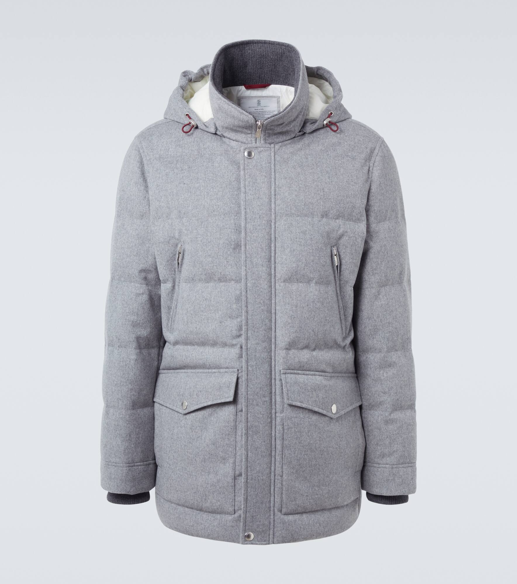 Brunello Cucinelli's designs are created in Solomeo, a medieval hamlet whose art and traditions are woven into the house's every fiber. This wool jacket features a padded style for extra warmth. Product Details - Material: 100% wool - Care instructions: dry clean - Made in Italy - Designer color name: Cwn01 - Item color: gray - Lining: 100% nylon - Pocket lining: 100% cotton - Material II: 60% wool, 30% cashmere, 10% silk - Filling: 90% down, 10% feathers - Interlining: 100% polyamide - Contains non-textile parts of animal origin - Pockets: patch pockets, zipped pockets, internal pockets - Closure: zipper, snap-button fastenings - Detachable hood - Includes: garment bag - Item number: P01055979 Size & Fit - True to size - Straight fit - Non-stretchy fabric - Falls below the hip - Height of model is 189cm-74.5" and wears a size L