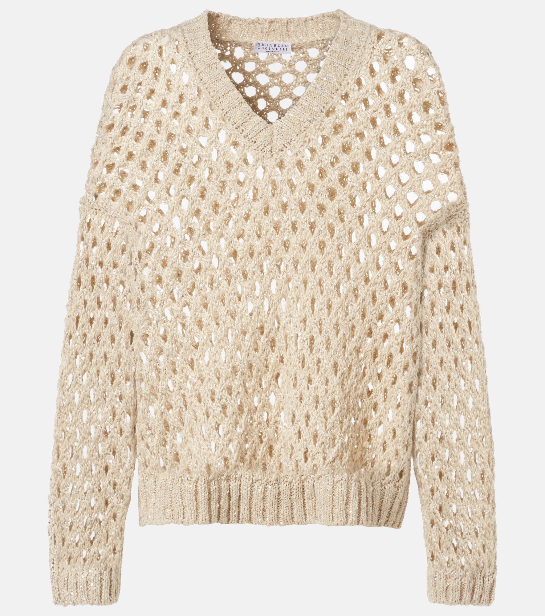 This V-neck sweater from Brunello Cucinelli has an open-knit construction and sparkling sequin details. Carefully crafted from a silk and linen blend, it makes for a sophisticated addition to your rotation. Product Details - Material: 36% silk, 34% linen, 30% polyamide - Care instructions: dry clean - Made in Italy - Designer color name: Warm Cream - Details: 100% polyester - Collar: V-neck - Hem: ribbed - Cuff: ribbed - Item number: P01041526 Size & Fit - True to size - Dropped shoulders - Designed for a loose fit - Non-stretchy fabric - Falls to the hip - The model seen in the picture is 178cm-5'10" and wearing a size XS
