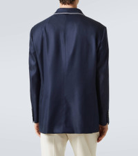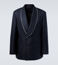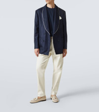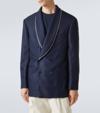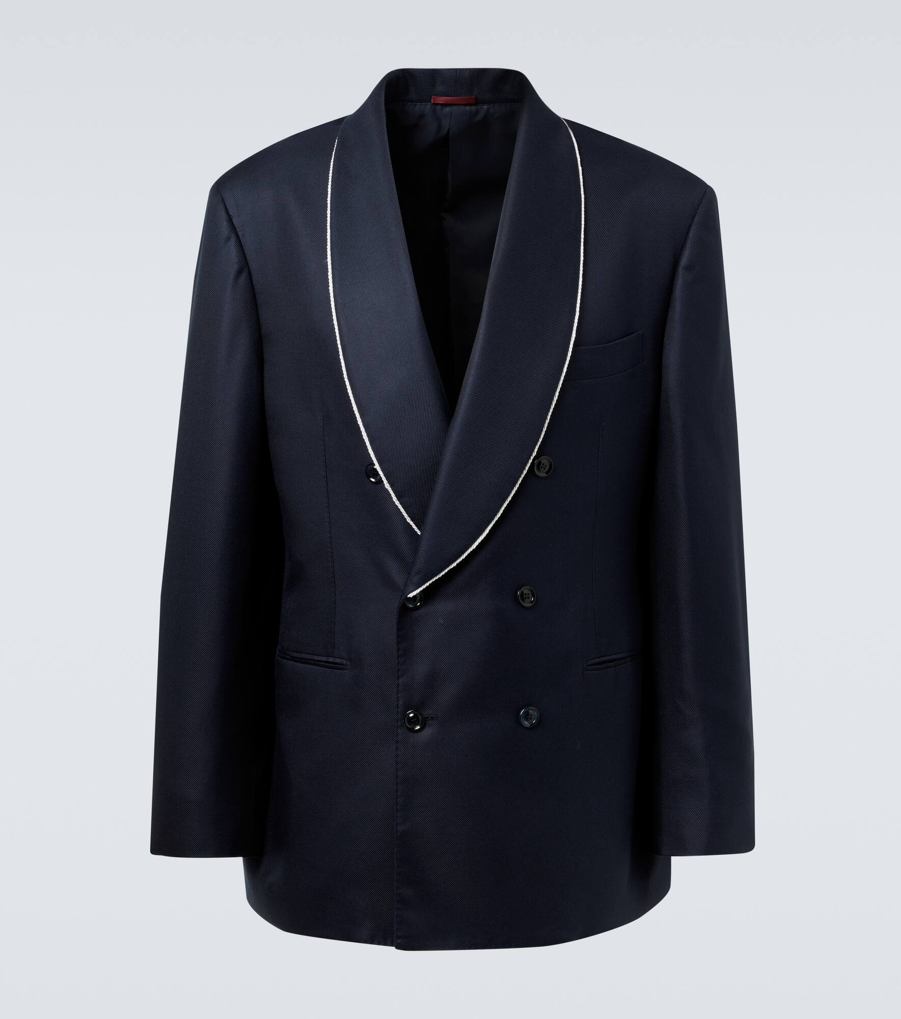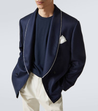 A sophisticated tuxedo jacket from Brunello Cucinelli is an excellent choice for formal occasions. Made in Italy from pure silk, the design has shawl lapels and contrast piping. Product Details - Material: 100% silk - Care instructions: dry clean - Made in Italy - Designer color name: Navy - Item color: blue - Includes: garment bag - Closure: double-breasted - Pockets: welt pockets, breast pocket - Lining: 100% cupro - Contains non-textile parts of animal origin - Buttoned cuffs - Item number: P01006801 Size & Fit - True to size - Shoulder pad inserts - Slim fit - Non-stretchy fabric - Falls below the hip - Height of model is 189cm-74.5" and wears a size IT 56