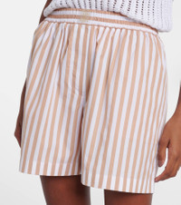 A closet classic that will never fail you, these Bermuda shorts from Brunello Cucinelli are the perfect pair for an effortlessly elegant look. Made from a sumptuous blend of cotton and silk, this high-rise style features a striped pattern allover. Product Details - Material: 81% cotton, 19% silk - Care instructions: hand wash - Made in Italy - Designer color name: Bianco/Camel - Item color: beige, white - Pockets: side slit pockets - Elasticated waistband - Material II: 74% acetate, 26% silk - Item number: P01016109 Size & Fit - True to size - Elasticated waist - Non-stretchy fabric - Wide-leg - The model seen in the picture is 178cm-5'10" and wearing a size XS