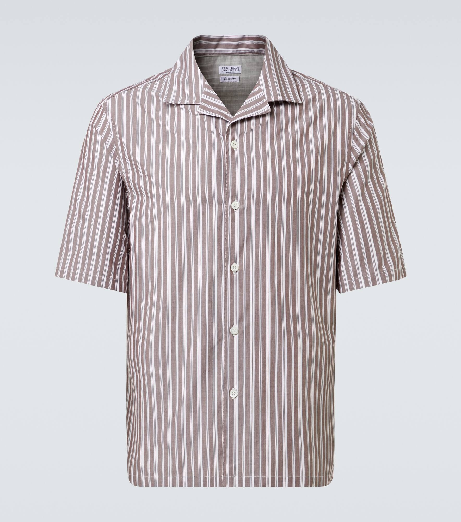 Brunello Cucinelli's designs are created in Solomeo, a medieval hamlet whose art and traditions are woven into the house's every fiber. Trascending occasions with its timeless design and subtlel branding, this bowling shirt is crafted from premium cotton and features a striped pattern. Product Details - Material: 100% cotton - Care instructions: machine wash at 30 degrees - Made in Italy - Designer color name: Corteccia/Panama - Item color: brown - Closure: buttoned front - Contains non-textile parts of animal origin - Item number: P01007089 Size & Fit - True to size - Without pleats in the back - Classic fit - Non-stretchy fabric - Falls to the hip - Height of model is 190cm-75" and wears a size L