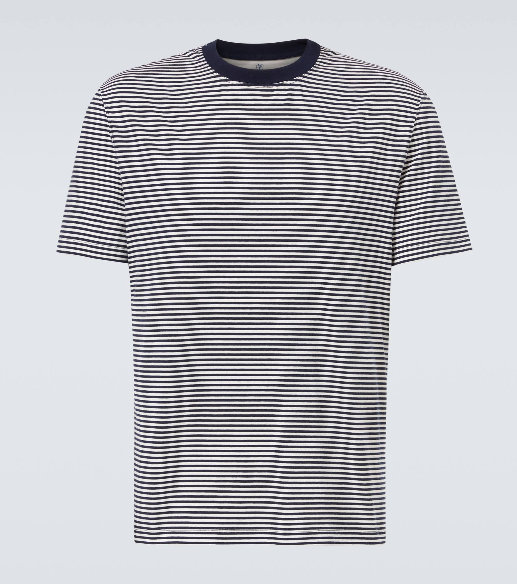 Casual staples like this classic T-shirt from Brunello Cucinelli can be some of the most versatile pieces in your wardrobe. It features an all-over striped pattern and a solid trim around the neckline. Product Details - Material: 100% cotton - Care instructions: machine wash at 30 degrees - Made in Italy - Designer color name: Navy White - Item color: blue, white - Item number: P01041935 Size & Fit - True to size - Straight fit - Slightly stretchy fabric - Falls to the hip - Height of model is 186cm-73" and wears a size M
