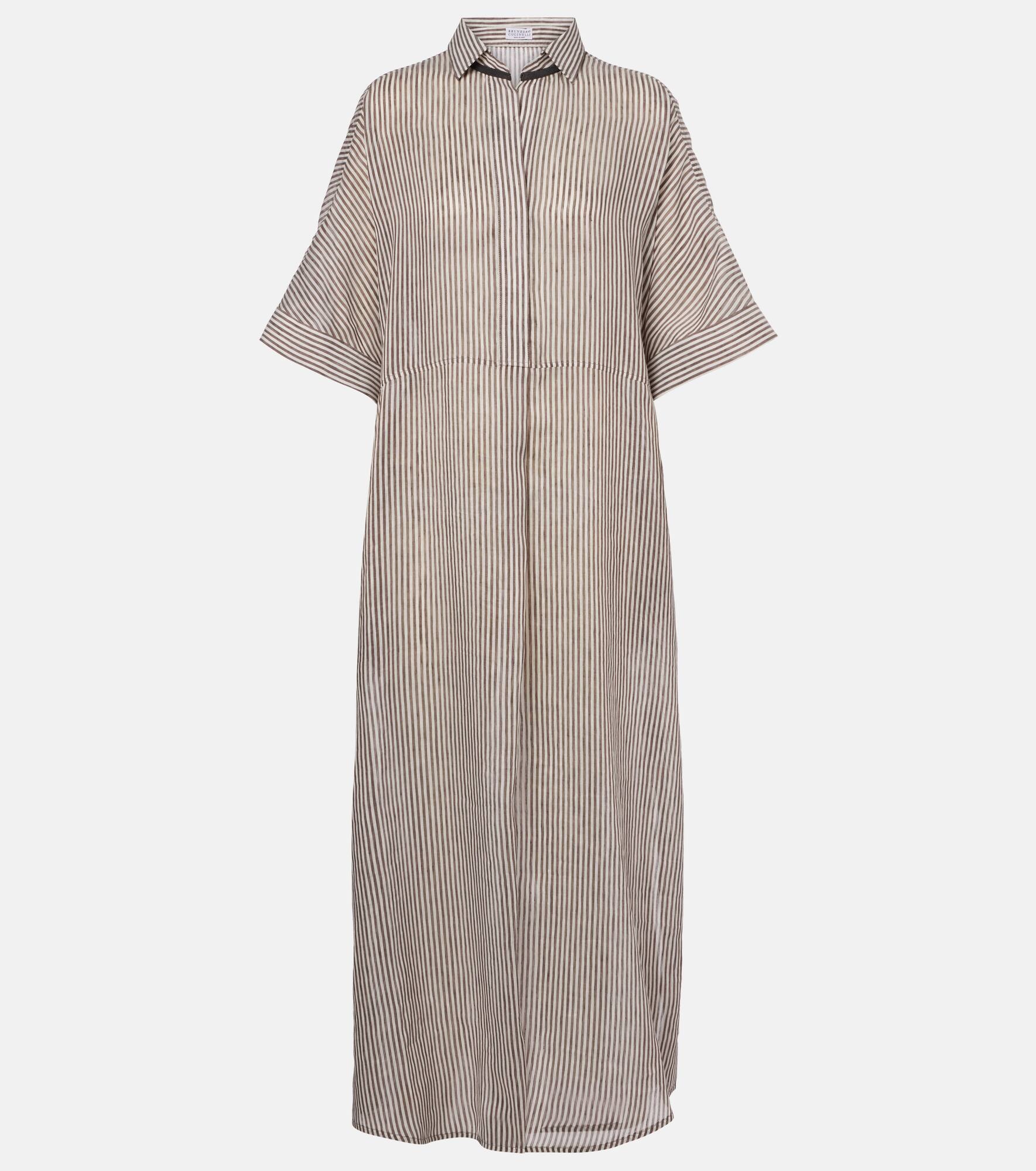Brunello Cucinelli's designs are created in Solomeo, a medieval hamlet whose art and traditions are woven into the house's every fiber. Primed for effortless summer looks, this shirt dress is made from breathable linen and silk and features a classic striped pattern. Product Details - Material: 78% linen, 22% silk - Care instructions: dry clean - Made in Italy - Designer color name: Bianco/Marrone - Item color: white, brown - Contains non-textile parts of animal origin - Item number: P01054505 Size & Fit - True to size - Semi-sheer - Oversized - Non-stretchy fabric - slit length 48cm-19" - The model seen in the picture is 178cm-5'10" and wearing a size XS