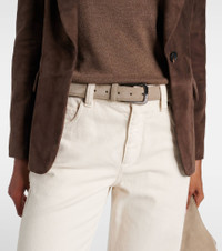 Brunello Cucinelli's designs are created in Solomeo, a medieval hamlet whose art and traditions are woven into the house's every piece. This elegant belt is crafted from buttery beige suede and exudes timeless elegance. Product Details - Material: leather (suede) - Lining: leather - Made in Italy - Designer color name: Ice - Item color: beige - Includes: box, dust bag - Item number: P01037914 Size & Fit - Width 3cm-1" - Buckle width 4cm-1.5" - Length of size XS = 78/88cm-30.5/34.5" - Length of size S = 82/92cm-32.5/36" - Length of size M = 86/96cm-34/38" - Length of size L = 90/100cm-35.5/39.5"