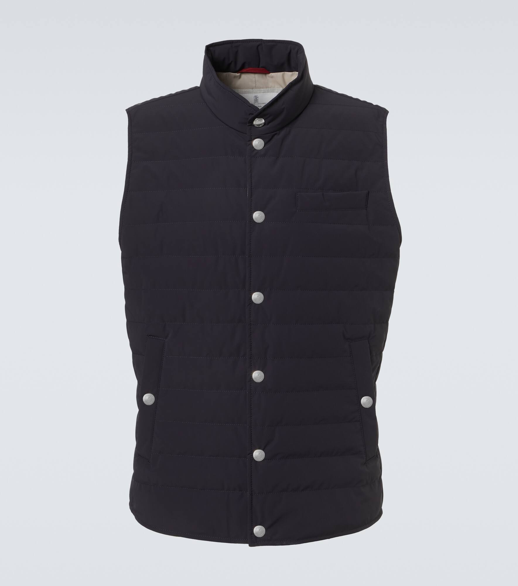 This technical puffer vest from Brunello Cucinelli offers a perfect balance of comfort, style, and modern edge. This piece features a snap-button fastening to ensure practical wearability. Product Details - Material: 87% polyamide, 13% elastane - Care instructions: specialist clean - Made in Italy - Designer color name: CVL16 - Item color: blue - Lining: 100% nylon - Interlining: 100% polyamide - Contains non-textile parts of animal origin - Closure: snap-buttoned fastenings - Pockets: slant pockets, welt pocket, internal pocket - Includes: dust bag - Item number: P01055990 Size & Fit - True to size - Straight fit - Non-stretchy fabric - Falls to the hip - Height of model is 189cm-74.5" and wears a size L