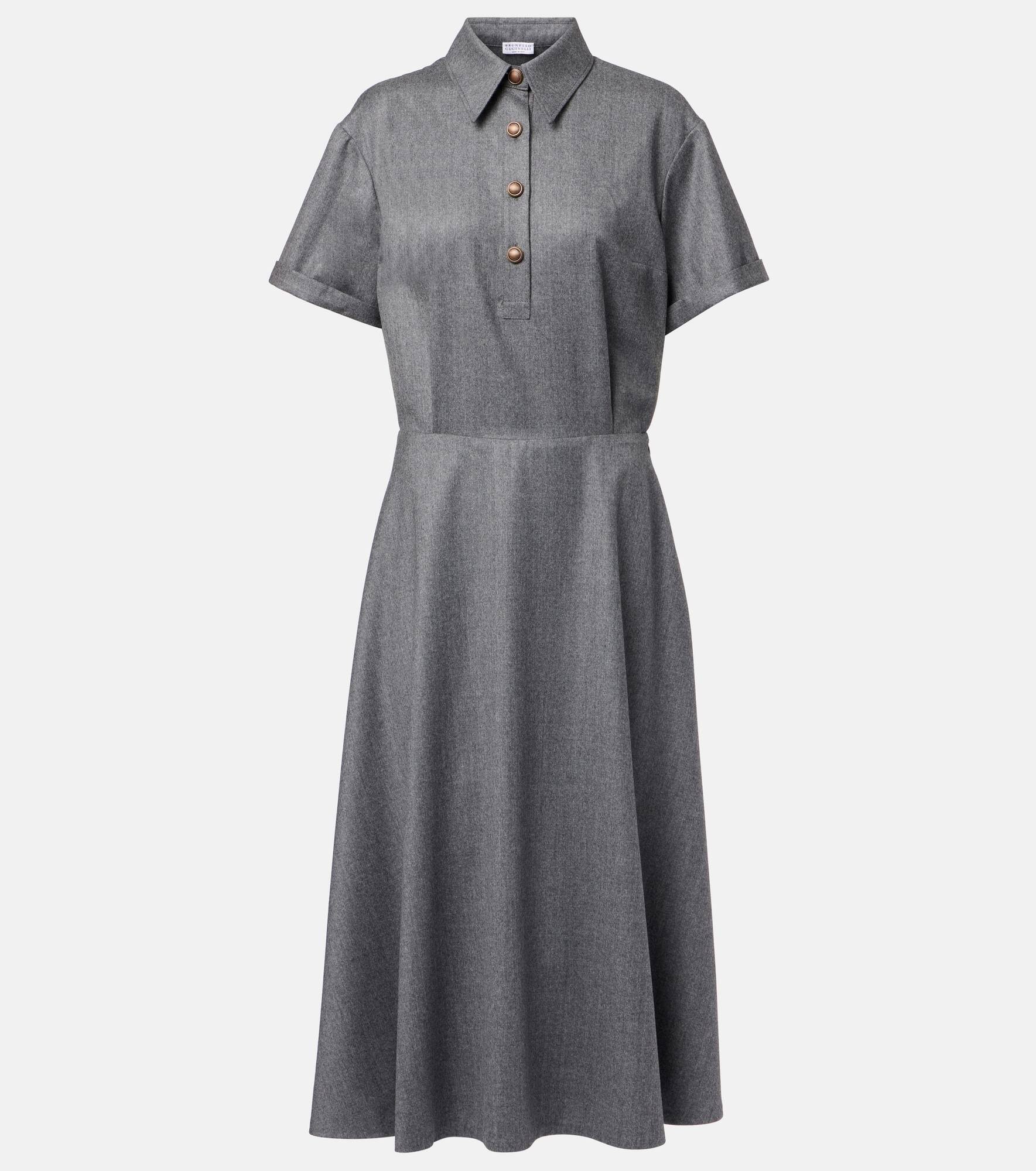 Crafted from wool, this shirt dress from Brunello Cucinelli features a polished silhouette with a softly pleated skirt and structured top. The design is complete with charming brass buttons at the front. Product Details - Material: 100% virgin wool - Care instructions: dry clean - Made in Italy - Designer color name: Mid Grey - Item color: gray - Lining: 65% acetate, 35% polyester - Details: 100% brass - Closure: partially buttoned front, zipped side - Collar: classic (Straight point) - Partially lined - Item number: P01083450 Size & Fit - True to size - For a closer fit, we recommend taking one size down - Dropped shoulders - Cinched waist - Non-stretchy fabric - The model seen in the picture is 178cm-5'10" and wearing a size XS