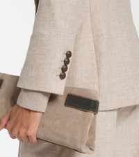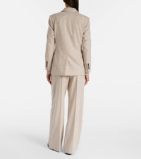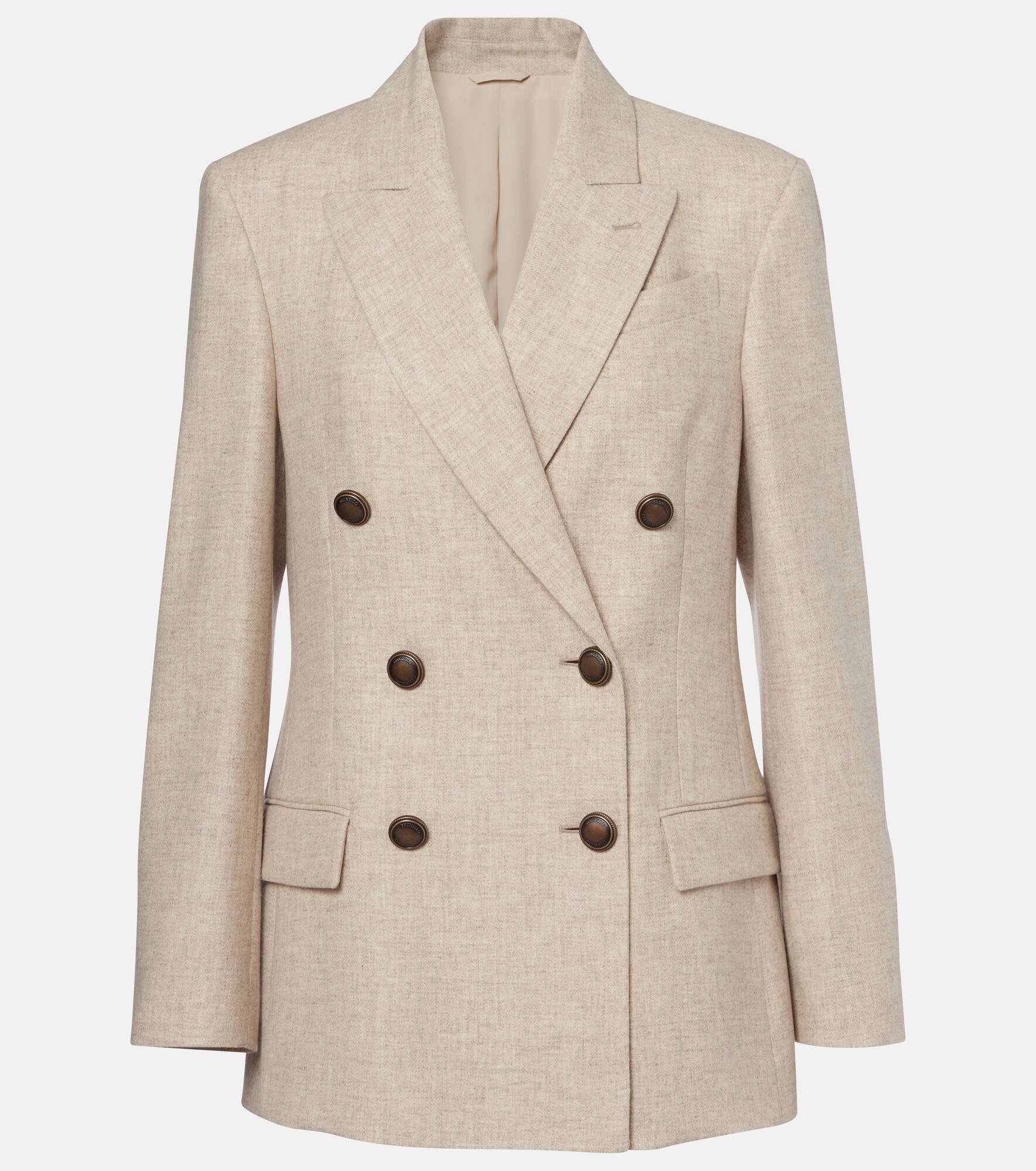 Brunello Cucinelli's designs are created in Solomeo, a medieval hamlet whose art and traditions are woven into the house's every fiber. This timeless blazer is expertly Italian-crafted from wool and cashmere into a double-breasted silhouette with peak lapels and flap pockets. Product Details - Material: 95% wool, 5% elastane - Care instructions: dry clean - Made in Italy - Designer color name: Beige - Item color: beige - Lining: 74% acetate, 26% silk - Sleeve lining: 65% acetate, 35% polyester - Details: 100% brass - Contains non-textile parts of animal origin - Closure: double-breasted (six buttons) - Pockets: flap pockets - Peak lapel - Cuff: four buttons - Shoulder pads - Vent: single - Fully lined - Includes: dust bag - Item number: P01083531 Size & Fit - True to size - Shoulder pad inserts - Straight fit - Non-stretchy fabric - Falls below the hip - Height of model is 179cm-70.5" and wears a size IT 40