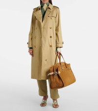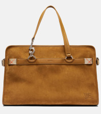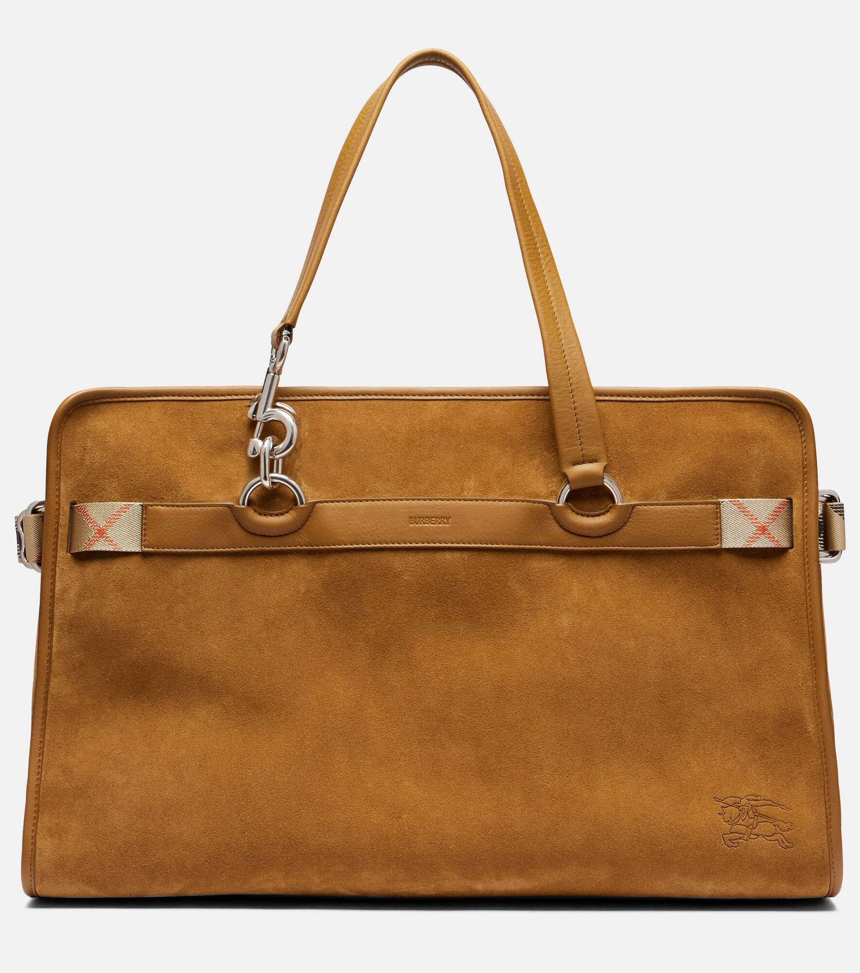 Made in Italy from buttery suede, the B Clip Holdall duffel bag from Burberry is a polished carryall staple. The logo-engraved handles and embossed equestrian design at the front add distinctiveness to this spacious design. Product Details - Material: leather (suede) - Lining: lamb leather - Made in Italy - Designer color name: Hebden - Item color: brown - Closure: two-way zipped top - Includes: dust bag - Hardware color: silver - Item number: P01034761 Size & Fit - Height 32cm-12.5" - Width 48cm-19" - Depth 22cm-8.5" - Length of handles 62cm-24.5"