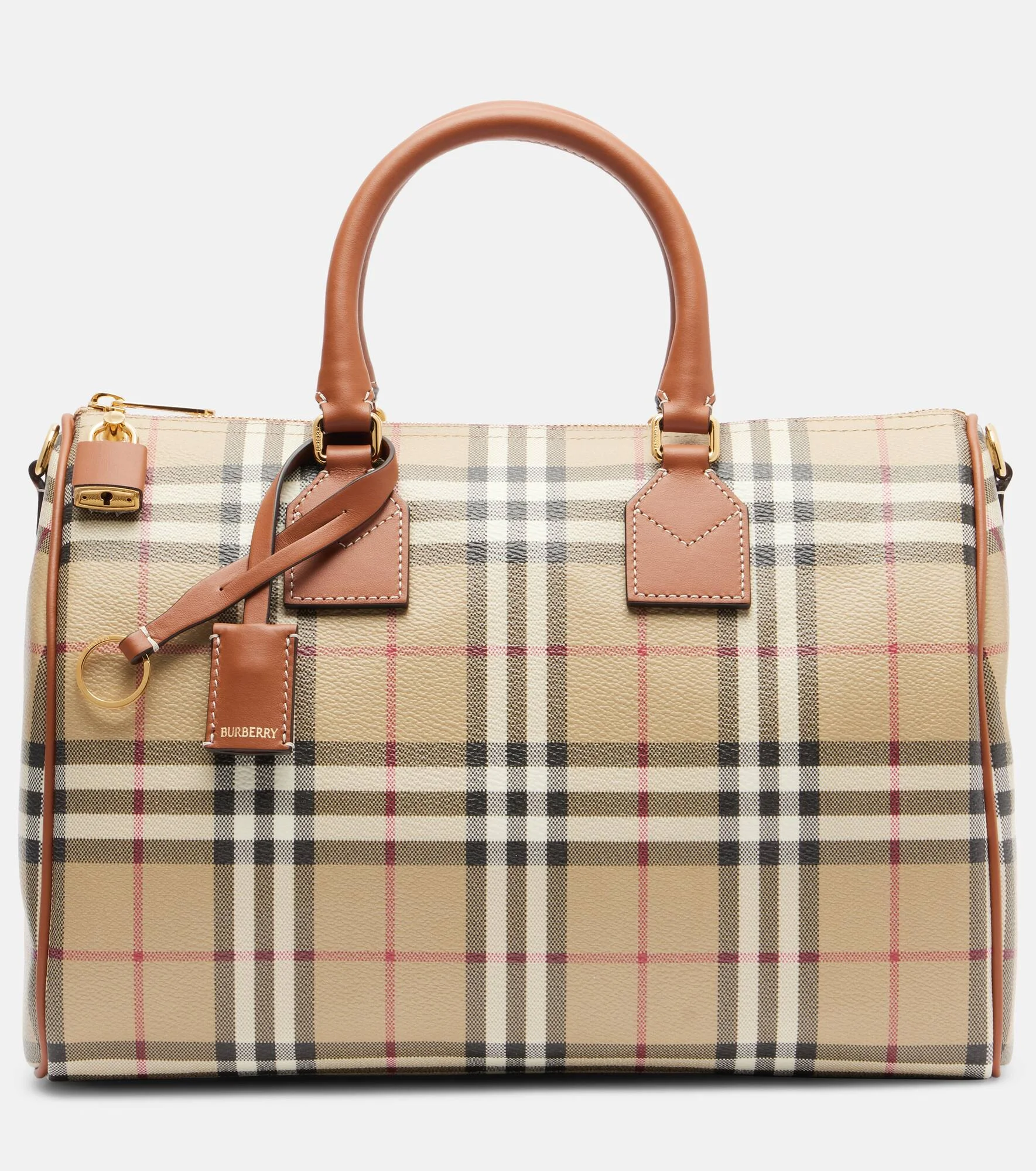 The Bowling Medium top-handle bag from Burberry makes a signature addition to your collection. Crafted from leather-trimmed canvas, the design features the Burberry Check motif all over. Product Details - Material: cotton, polyurethane, polyester - Lining: fabric - Made in Italy - Color: beige - Designer color name: Vntg Chk/Briar Brown - Hardware color: gold - Top handles, Detachable, adjustable shoulder strap - Internal details: single compartment - Closure: zipped top - Detachable charm - Protective leather bottom - Includes: dust bag - Item number: P01126621 Size & Fit - Height 21,5 cm-8.5" - Width 30,5cm-12" - Depth 14,5cm-5.5" - Length of handles 32cm-12.5" - Adjustable shoulder strap - Min. length shoulder strap 77cm-30.5" - Max. length shoulder strap 87cm-34.5"