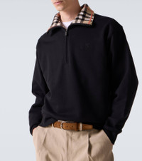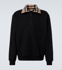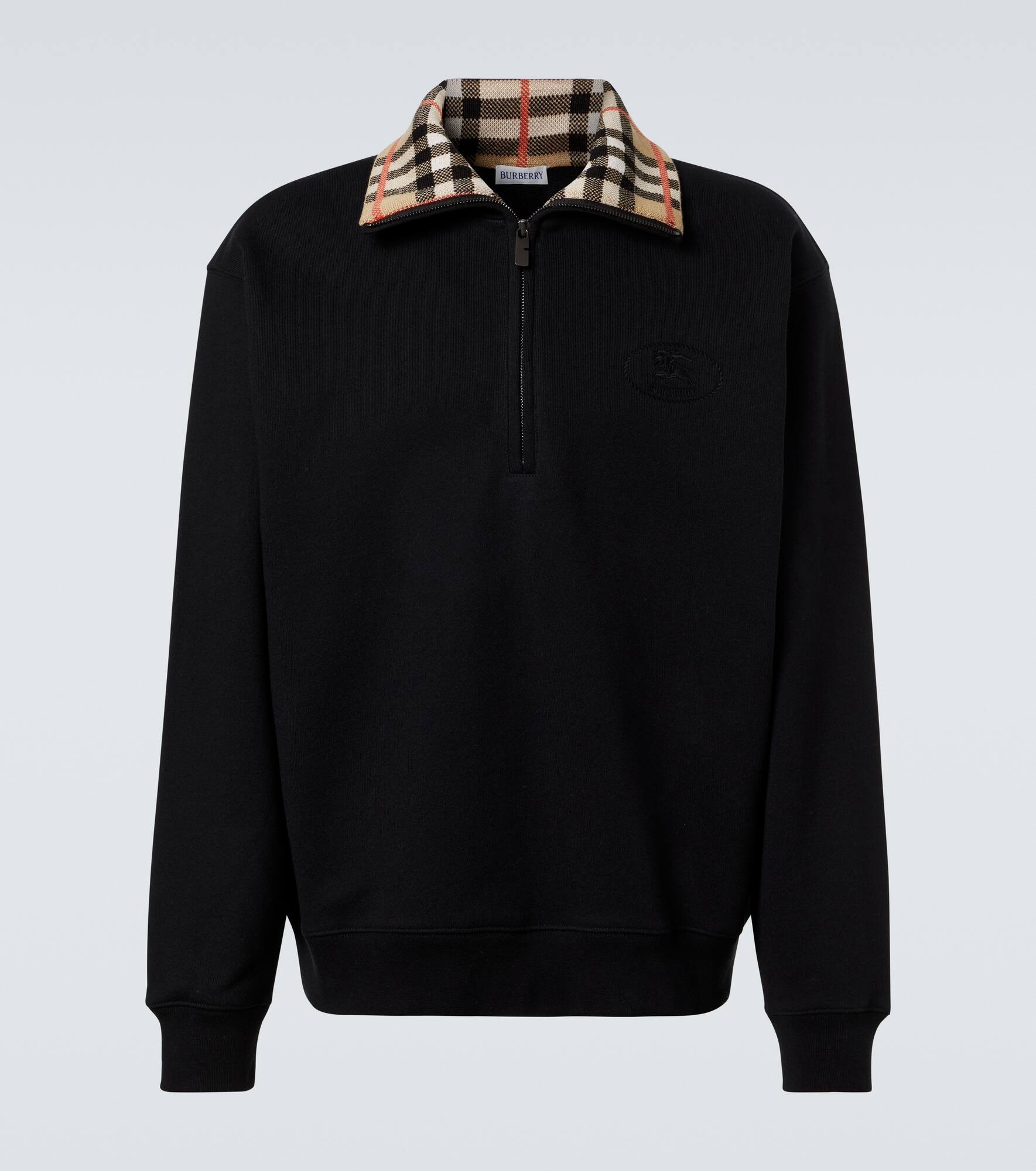 This Burberry half-zip sweatshirt is made from soft cotton jersey and finished with the Equestrian Knight Design embroidery. The high neck folds down into a classic collar, revealing a signature Burberry Check lining for a signature touch. Product Details - Material: 100% cotton - Care instructions: hand wash - Made in Portugal - Designer color name: Black - Item color: black - Trim: 99% cotton, 1% elastane - Closure: partially zipped front - Item number: P01066737 Size & Fit - True to size - Dropped shoulders - Designed for a loose fit - Elasticated hem - Non-stretchy fabric - Falls to the hip - Height of model is 189cm-74.5" and wears a size L